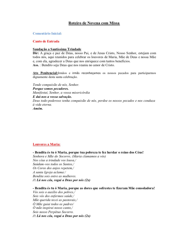 Comentrio Inicial: Canto de Entrada Saudao a Santssima Trindade Dir: A graa e paz de Deus, nosso Pai, e de Jesus Cristo, Nosso Senhor, estejam com todos ns, aqui reunidos para celebrar os louvores de Maria, Me de Deus e nossa Me e, com ela, agradecer a Deus que nos enriquece com tantos benefcios. Ass. : Bendito seja Deus que nos reuniu no amor de Cristo. Ato Penitencial:Irmos e irms reconheamos os nossos pecados para participarmos dignamente desta santa celebrao. Tende compaixo de ns, Senhor. Porque somos pecadores. Manifestai, Senhor, a vossa misericrdia E dai-nos a vossa salvao. Deus todo-poderoso tenha compaixo de ns, perdoe os nossos pecados e nos conduza vida eterna. Amm.