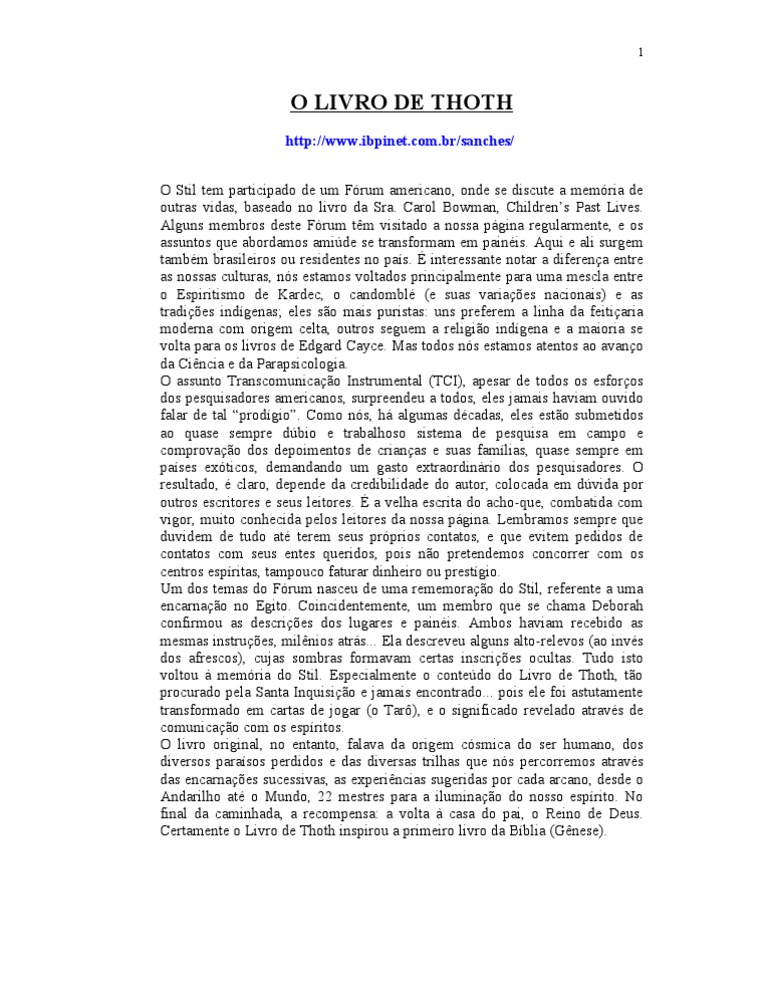 http://www.ibpinet.com.br/sanches/ O Stil tem participado de um Frum americano, onde se discute a memria de outras vidas, baseado no livro da Sra. Carol Bowman, Childrens Past Lives. Alguns membros deste Frum tm visitado a nossa pgina regularmente, e os assuntos que abordamos amide se transformam em painis. Aqui e ali surgem tambm brasileiros ou residentes no pas. interessante notar a diferena entre as nossas culturas, ns estamos voltados principalmente para uma mescla entre o Espiritismo de Kardec, o candombl (e suas variaes nacionais) e as tradies indgenas; eles so mais puristas: uns preferem a linha da feitiaria moderna com origem celta, outros seguem a religio indgena e a maioria se volta para os livros de Edgard Cayce. Mas todos ns estamos atentos ao avano da Cincia e da Parapsicologia. O assunto Transcomunicao Instrumental (TCI), apesar de todos os esforos dos pesquisadores americanos, surpreendeu a todos, eles jamais haviam ouvido falar de tal prodgio. Como ns, h algumas dcadas, eles esto submetidos ao quase sempre dbio e trabalhoso sistema de pesquisa em campo e comprovao dos depoimentos de crianas e suas famlias, quase sempre em pases exticos, demandando um gasto extraordinrio dos pesquisadores. O resultado, claro, depende da credibilidade do autor, colocada em dvida por outros escritores e seus leitores. a velha escrita do acho-que, combatida com vigor, muito conhecida pelos leitores da nossa pgina. Lembramos sempre que duvidem de tudo at terem seus prprios contatos, e que evitem pedidos de contatos com seus entes queridos, pois no pretendemos concorrer com os centros espritas, tampouco faturar dinheiro ou prestgio. Um dos temas do Frum nasceu de uma rememorao do Stil, referente a uma encarnao no Egito. Coincidentemente, um membro que se chama Deborah confirmou as descries dos lugares e painis. Ambos haviam recebido as mesmas instrues, milnios atrs... Ela descreveu alguns alto-relevos (ao invs dos afrescos), cujas sombras formavam certas inscries ocultas. Tudo isto voltou memria do Stil. Especialmente o contedo do Livro de Thoth, to procurado pela Santa Inquisio e jamais encontrado... pois ele foi astutamente transformado em cartas de jogar (o Tar), e o significado revelado atravs de comunicao com os espritos. O livro original, no entanto, falava da origem csmica do ser humano, dos diversos parasos perdidos e das diversas trilhas que ns percorremos atravs das encarnaes sucessivas, as experincias sugeridas por cada arcano, desde o Andarilho at o Mundo, 22 mestres para a iluminao do nosso esprito. No final da caminhada, a recompensa: a volta casa do pai, o Reino de Deus. Certamente o Livro de Thoth inspirou a primeiro livro da Bblia (Gnese).