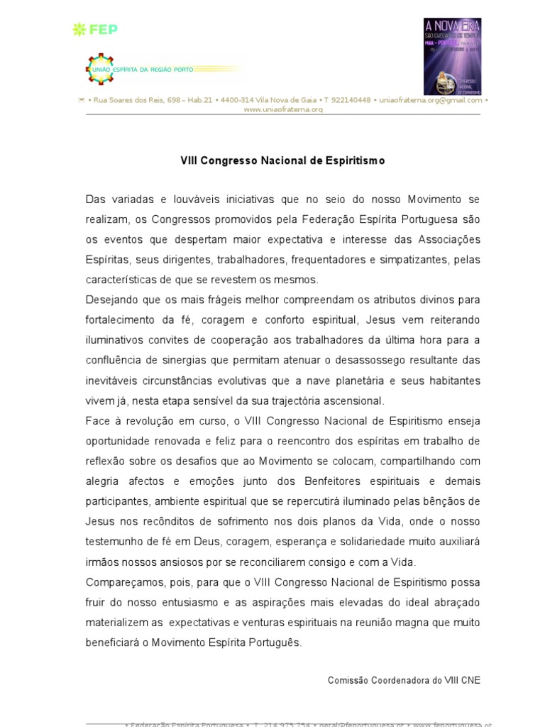 VIII Congresso Nacional de Espiritismo Das variadas e louvveis iniciativas que no seio do nosso Movimento se realizam, os Congressos promovidos pela Federao Esprita Portuguesa so os eventos que despertam maior expectativa e interesse das Associaes Espritas, seus dirigentes, trabalhadores, frequentadores e simpatizantes, pelas caractersticas de que se revestem os mesmos. Desejando que os mais frgeis melhor compreendam os atributos divinos para fortalecimento da f, coragem e conforto espiritual, Jesus vem reiterando iluminativos convites de cooperao aos trabalhadores da ltima hora para a confluncia de sinergias que permitam atenuar o desassossego resultante das inevitveis circunstncias evolutivas que a nave planetria e seus habitantes vivem j, nesta etapa sensvel da sua trajectria ascensional. Face revoluo em curso, o VIII Congresso Nacional de Espiritismo enseja oportunidade renovada e feliz para o reencontro dos espritas em trabalho de reflexo sobre os desafios que ao Movimento se colocam, compartilhando com alegria afectos e emoes junto dos Benfeitores espirituais e demais participantes, ambiente espiritual que se repercutir iluminado pelas bnos de Jesus nos recnditos de sofrimento nos dois planos da Vida, onde o nosso testemunho de f em Deus, coragem, esperana e solidariedade muito auxiliar irmos nossos ansiosos por se reconciliarem consigo e com a Vida. Compareamos, pois, para que o VIII Congresso Nacional de Espiritismo possa fruir do nosso entusiasmo e as aspiraes mais elevadas do ideal abraado materializem as expectativas e venturas espirituais na reunio magna que muito beneficiar o Movimento Esprita Portugus.
