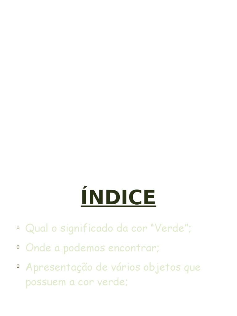 Qual o significado da cor Verde; Onde a podemos encontrar; Apresentao de vrios objetos que possuem a cor verde;