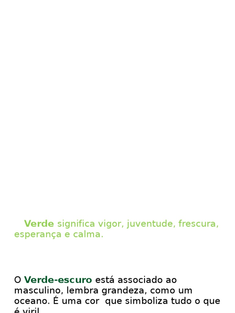OVerdesignifica vigor, juventude, frescura, esperana e calma. OVerde-escuroest associado ao masculino, lembra grandeza, como um oceano. uma cor que simboliza tudo o que viril.
