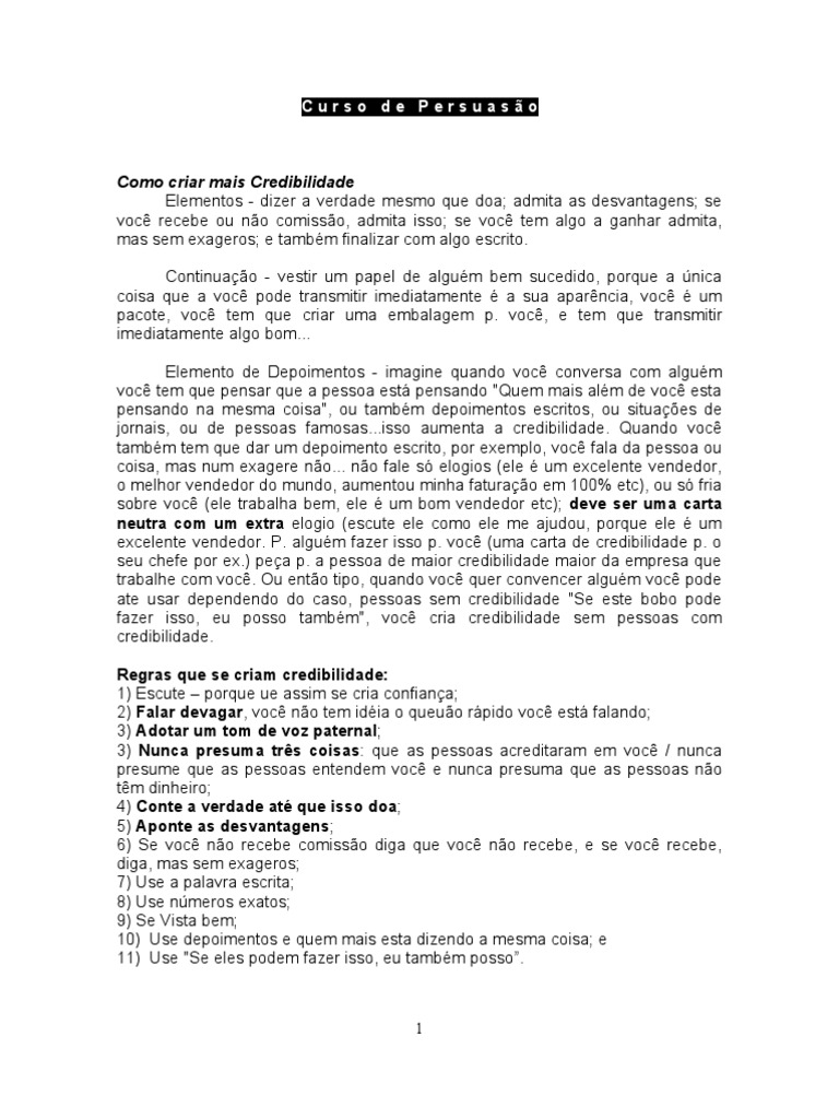 Como criar mais Credibilidade Elementos - dizer a verdade mesmo que doa; admita as desvantagens; se você recebe ou não comissão, admita isso; se você tem algo a ganhar admita, mas sem exageros; e também finalizar com algo escrito. Continuação - vestir um papel de alguém bem sucedido, porque a única coisa que a você pode transmitir imediatamente é a sua aparência, você é um pacote, você tem que criar uma embalagem p. você, e tem que transmitir imediatamente algo bom... Elemento de Depoimentos - imagine quando você conversa com alguém você tem que pensar que a pessoa está pensando "Quem mais além de você esta pensando na mesma coisa", ou também depoimentos escritos, ou situações de jornais, ou de pessoas famosas...isso aumenta a credibilidade. Quando você também tem que dar um depoimento escrito, por exemplo, você fala da pessoa ou coisa, mas num exagere não... não fale só elogios (ele é um excelente vendedor, o melhor vendedor do mundo, aumentou minha faturação em 100% etc), ou só fria sobre você (ele trabalha bem, ele é um bom vendedor etc); deve ser uma carta neutra com um extra elogio (escute ele como ele me ajudou, porque ele é um excelente vendedor. P. alguém fazer isso p. você (uma carta de credibilidade p. o seu chefe por ex.) peça p. a pessoa de maior credibilidade maior da empresa que trabalhe com você. Ou então tipo, quando você quer convencer alguém você pode ate usar dependendo do caso, pessoas sem credibilidade "Se este bobo pode fazer isso, eu posso também", você cria credibilidade sem pessoas com credibilidade. Regras que se criam credibilidade: 1) Escute – porque ue assim se cria confiança; 2) Falar devagar, você não tem idéia o queuão rápido você está falando; 3) Adotar um tom de voz paternal; 3) Nunca presuma três coisas: que as pessoas acreditaram em você / nunca presume que as pessoas entendem você e nunca presuma que as pessoas não têm dinheiro; 4) Conte a verdade até que isso doa; 5) Aponte as desvantagens; 6) Se você não recebe comissão diga que você não recebe, e se você recebe, diga, mas sem exageros; 7) Use a palavra escrita; 8) Use números exatos; 9) Se Vista bem; 10) Use depoimentos e quem mais esta dizendo a mesma coisa; e 11) Use "Se eles podem fazer isso, eu também posso”.