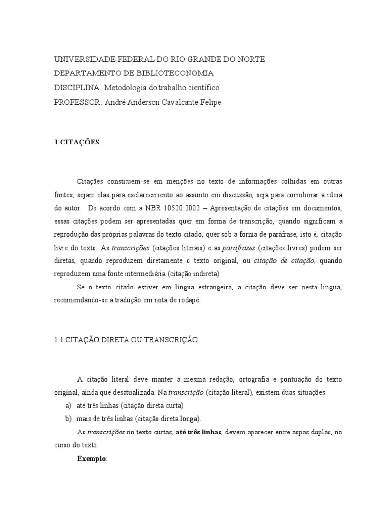 Citaes constituem-se em menes no texto de informaes colhidas em outras fontes, sejam elas para esclarecimento ao assunto em discusso, seja para corroborar a ideia do autor. De acordo com a NBR 10520:2002 Apresentao de citaes em documentos, essas citaes podem ser apresentadas quer em forma de transcrio, quando significam a reproduo das prprias palavras do texto citado, quer sob a forma de parfrase, isto , citao livre do texto. As transcries (citaes literais) e as parfrases (citaes livres) podem ser diretas, quando reproduzem diretamente o texto original, ou citao de citao, quando reproduzem uma fonte intermediria (citao indireta). Se o texto citado estiver em lngua estrangeira, a citao deve ser nesta lngua, recomendando-se a traduo em nota de rodap.