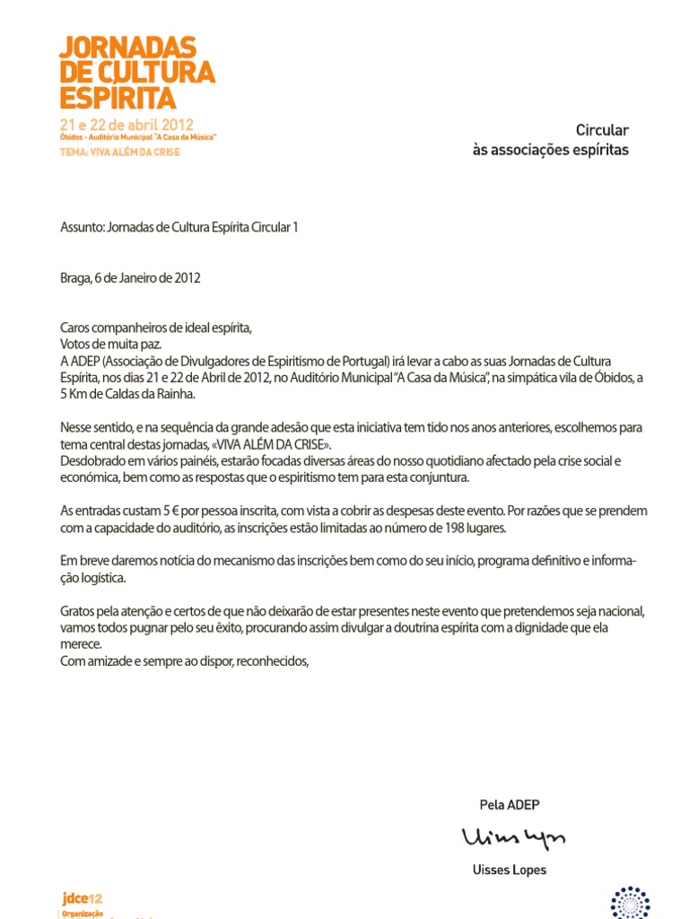 Assunto: Jornadas de Cultura Esprita Circular 1 Braga, 6 de Janeiro de 2012 Caros companheiros de ideal esprita, Votos de muita paz. A ADEP (Associao de Divulgadores de Espiritismo de Portugal) ir levar a cabo as suas Jornadas de Cultura Esprita, nos dias 21 e 22 de Abril de 2012, no Auditrio Municipal A Casa da Msica na simptica vila de bidos, a , 5 Km de Caldas da Rainha. Nesse sentido, e na sequncia da grande adeso que esta iniciativa tem tido nos anos anteriores, escolhemos para tema central destas jornadas, VIVA ALM DA CRISE. Desdobrado em vrios painis, estaro focadas diversas reas do nosso quotidiano afectado pela crise social e econmica, bem como as respostas que o espiritismo tem para esta conjuntura. As entradas custam 5 por pessoa inscrita, com vista a cobrir as despesas deste evento. Por razes que se prendem com a capacidade do auditrio, as inscries esto limitadas ao nmero de 198 lugares. Em breve daremos notcia do mecanismo das inscries bem como do seu incio, programa de nitivo e informao logstica. Gratos pela ateno e certos de que no deixaro de estar presentes neste evento que pretendemos seja nacional, vamos todos pugnar pelo seu xito, procurando assim divulgar a doutrina esprita com a dignidade que ela merece. Com amizade e sempre ao dispor, reconhecidos,