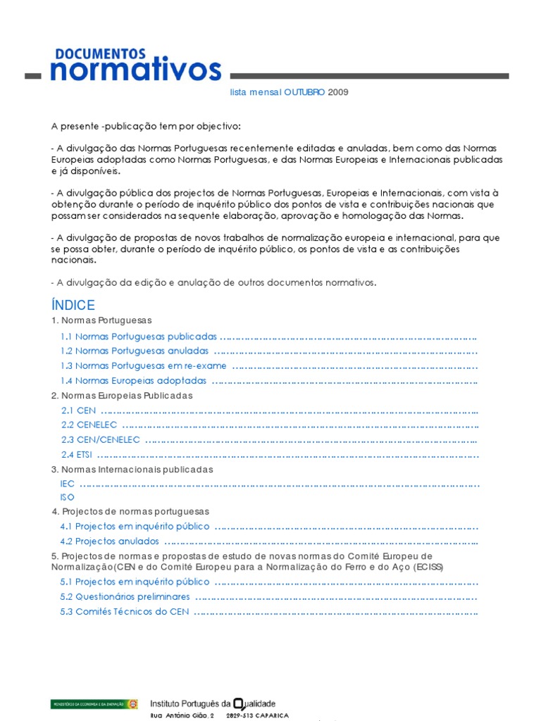 1. Normas Portuguesas 1.1 Normas Portuguesas publicadas …………………………………………………………………………. 1.2 Normas Portuguesas anuladas …………………………………………………………………………… 1.3 Normas Portuguesas em re-exame ……………………………………………………………………… 1.4 Normas Europeias adoptadas ……………………………………………………………………………. 2. Normas Europeias Publicadas 2.1 CEN …………………………………………………………………………………………………………….. 2.2 CENELEC ………………………………………………………………………………………………………. 2.3 CEN/CENELEC ……………………………………………………………………………………………….. 2.4 ETSI ……………………………………………………………………………………………………………… 3. Normas Internacionais publicadas IEC …………………………………………………………………………………………………………………… ISO 4. Projectos de normas portuguesas 4.1 Projectos em inquérito público …………………………………………………………………………… 4.2 Projectos anulados ………………………………………………………………………………………….. 5. Projectos de normas e propostas de estudo de novas normas do Comité Europeu de Normalização(CEN e do Comité Europeu para a Normalização do Ferro e do Aço (ECISS) 5.1 Projectos em inquérito público …………………………………………………………………………… 5.2 Questionários preliminares ………………………………………………………………………………… 5.3 Comités Técnicos do CEN ………………………………………………………………………………….