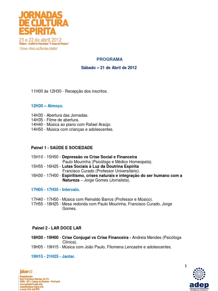 15H10 - 15H50 - Depressão vs Crise Social e Financeira Paulo Mourinha (Psicólogo e Médico Homeopata). 15H55 - 16H25 - Lutas Sociais à Luz da Doutrina Espírita Francisco Curado (Professor Universitário). 16H30 - 17H00 - Espiritismo, crises naturais e integração do ser humano com a Natureza – Jorge Gomes (Jornalista).