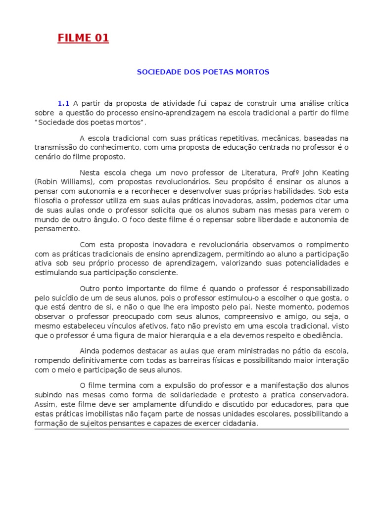 1.1 A partir da proposta de atividade fui capaz de construir uma anlise crtica sobre a questo do processo ensino-aprendizagem na escola tradicional a partir do filme Sociedade dos poetas mortos. A escola tradicional com suas prticas repetitivas, mecnicas, baseadas na transmisso do conhecimento, com uma proposta de educao centrada no professor o cenrio do filme proposto. Nesta escola chega um novo professor de Literatura, Prof John Keating (Robin Williams), com propostas revolucionrios. Seu propsito ensinar os alunos a pensar com autonomia e a reconhecer e desenvolver suas prprias habilidades. Sob esta filosofia o professor utiliza em suas aulas prticas inovadoras, assim, podemos citar uma de suas aulas onde o professor solicita que os alunos subam nas mesas para verem o mundo de outro ngulo. O foco deste filme o repensar sobre liberdade e autonomia de pensamento. Com esta proposta inovadora e revolucionria observamos o rompimento com as prticas tradicionais de ensino aprendizagem, permitindo ao aluno a participao ativa sob seu prprio processo de aprendizagem, valorizando suas potencialidades e estimulando sua participao consciente. Outro ponto importante do filme quando o professor responsabilizado pelo suicdio de um de seus alunos, pois o professor estimulou-o a escolher o que gosta, o que est dentro de si, e no o que lhe era imposto pelo pai. Neste momento, podemos observar o professor preocupado com seus alunos, compreensivo e amigo, ou seja, o mesmo estabeleceu vnculos afetivos, fato no previsto em uma escola tradicional, visto que o professor uma figura de maior hierarquia e a ela devemos respeito e obedincia. Ainda podemos destacar as aulas que eram ministradas no ptio da escola, rompendo definitivamente com todas as barreiras fsicas e possibilitando maior interao com o meio e participao de seus alunos. O filme termina com a expulso do professor e a manifestao dos alunos subindo nas mesas como forma de solidariedade e protesto a pratica conservadora. Assim, este filme deve ser amplamente difundido e discutido por educadores, para que estas prticas imobilistas no faam parte de nossas unidades escolares, possibilitando a formao de sujeitos pensantes e capazes de exercer cidadania.