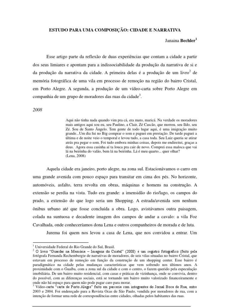 Universidade Federal do Rio Grande do Sul, Brasil. O livro “Guardar na Memória – Imagens do Cristal” (2008) é um registro fotográfico (feito pela fotógrafa Fernanda Rechemberg)e de narrativas de moradores, de seis vilas situadas no bairro Cristal, que estavam em processo de remoção em função da construção de um shopping center. Esse bairro é paradigmático na cidade pelas mudanças características que vem sofrendo nos últimos anos. A proximidade com o Guaíba, com a zona sul da cidade e com o centro, o fazem querido pela especulação imobiliária. De um bairro muito residencial, com casas e práticas de vizinhança, onde se convivia, dentro do possível, com as diferenças sociais, está se tornando um bairro muito valorizado financeiramente e onde não há espaço para quem não pode pagar caro para morar. 3 Vídeo-carta “carta de Porto Alegre” feito em parceria com integrantes do Jornal Boca de Rua, entre 2003 e 2004. Foi endereçado para a Revista Ocas de São Paulo, vendida por moradores de rua, com a intenção de formar uma rede de correspondências entre cidades, olhadas pelos habitantes das ruas.