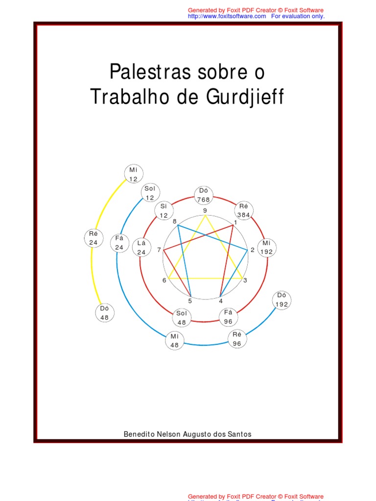 Ao se completar. si) e se chama a lei dos 7. mi. e entre si e dó há outro. Eneagrama Todos os caminhos possuem símbolos e lendas. A primeira foi na 11 . ré. Dentro do absoluto ou uno. no intervalo do semitom. Vamos dizer que um prato de comida seja o início.com For evaluation only. na segunda ponta do triângulo. esta é a lei dos 7 da evolução: 1/7 = 0. completa uma oitava. No Raio de Criação todos esses mundos estão em evolução junto com os seres que eles possuem. A outra lei é a da evolução de tudo o que existe fora do absoluto e se manifesta igual à escala musical (dó. sol. dogmas e rituais. fá. o eneagrama possui aquilo que necessitamos para a prática e para as idéias do Trabalho de Gurdjieff. entre mi e fá há um semitom. Ao entrar na boca. chega até mi-192. si. Em nossa escala evolutiva da alimentação é a mesma lei como veremos no eneagrama. forma uma oitava e se inicia em outra escala superior.foxitsoftware. lá. Cada nota possui um grupo diferente de vibrações que são desiguais entre si. Dentro dele está um triângulo. O Eneagrama se inicia com um círculo que simboliza a limitação da nossa compreensão. reação e neutralização. desde a pedra até o absoluto. Essas leis e suas interligações estão dentro do nosso eneagrama.Generated by Foxit PDF Creator © Foxit Software http://www. Dessa forma. Em tudo essa lei se manifesta. seria uma escala descendente dó. sol. como dó-192. etc. que seria a interferência da lei dos três. Ao cair no estômago. pois precisa sofrer um choque para continuar a sua transmutação. Nesses semitons podemos falar que existe um intervalo ou descontinuidade de vibrações. Do absoluto até nós. E no dó completa-se uma escala. transforma-se em uma pasta ou ré-384. Aí ele pára. além dos níveis em que se encontram. que contém ensinamentos de nível superior para compreensão dos níveis inferiores e agem como influências e dicas para seus seguidores alcançarem outra compreensão. Para nós. É onde entra outro alimento inicial. onde se inicia outra oitava.142857. como na escala musical. lá. que desta forma. Sabemos que a nota musical tem tons e semitons. que é a lei do três: ação. ou dó-768.