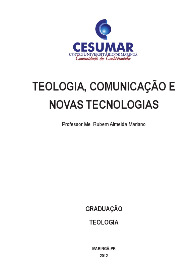 CENTRO UNIVERSITRIO DE MARING. Ncleo de Educao a distncia: C397 Teologia, comunicao e novas tecnologias / Rubem Almeida Mariano - Maring - PR, 2012. 70 p. Graduao em Teologia - EaD . . 1. Teologia. 2. Pensamento cristo. 3. Tecnologias. 4. EaD. I. Ttulo. CDD - 22 ed. 230 CIP - NBR 12899 - AACR/2