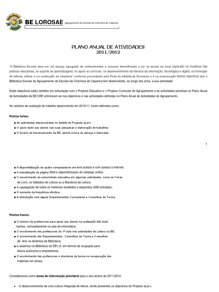 - Elaborar um programa coerente e sistemtico de promoo das competncias da leitura, da escrita e das literacias, em articulao com as diferentes estruturas pedaggicas e de acordo com as linhas orientadoras do Projecto Educativo e Projecto Curricular do Agrupamento - Articular as actividades do PAA com as actividades a desenvolver no mbito do Projecto Charneca aLer+ - Desenvolver actividades de animao leitura nas duas escolas do Agrupamento Feiras do Livro, Concursos de leitura, Divulgao de Livros e autores, encontros com escritores e ilustradores, sesses de leitura e apresentao de livros no mbito do Projecto Charneca aLer+ - Actualizar os guias de leitura de acordo com os diferentes nveis de escolaridade - Prever a abertura num horrio alargado, incluindo alguns sbados de manh, de modo a fomentar a utilizao autnoma pelos alunos e toda a comunidade - Fomentar a utilizao da BE como instrumento de lazer e trabalho autnomo