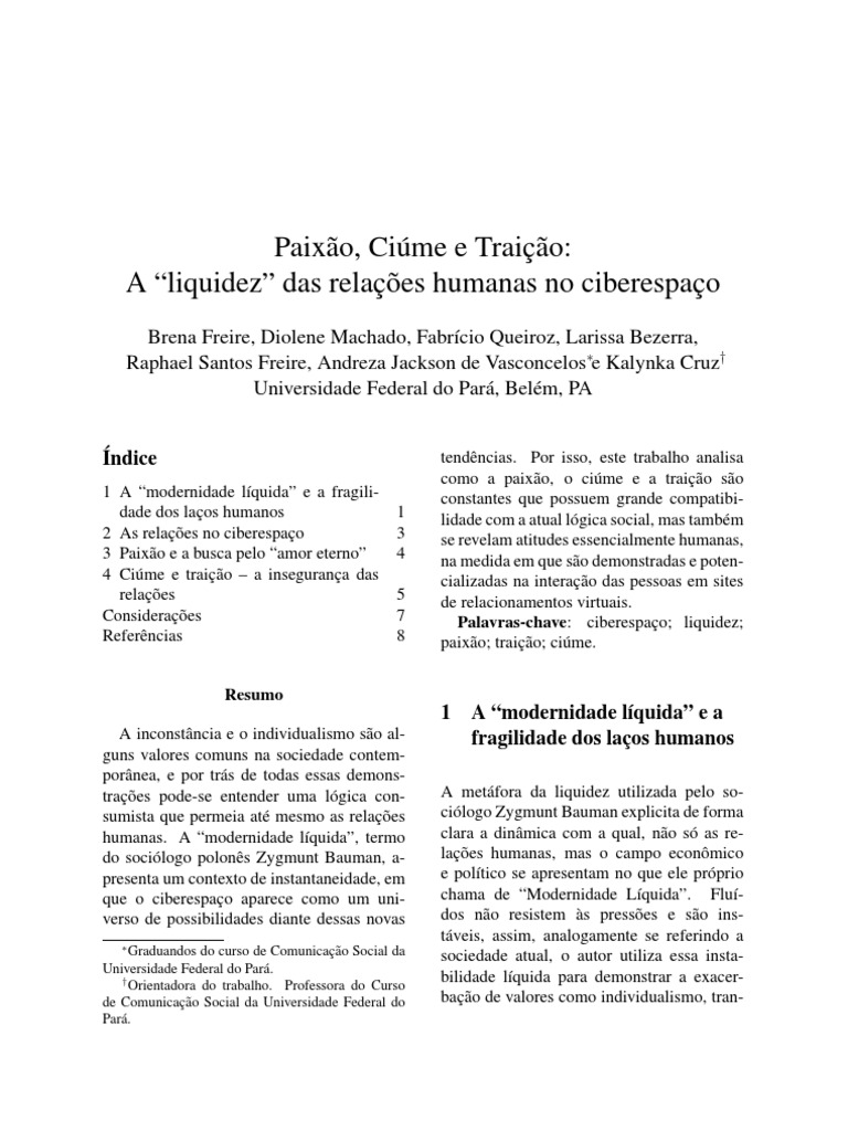 1 A modernidade lquida e a fragilidade dos laos humanos 2 As relaes no ciberespao 3 Paixo e a busca pelo amor eterno 4 Cime e traio a insegurana das relaes Consideraes Referncias 1 3 4 5 7 8