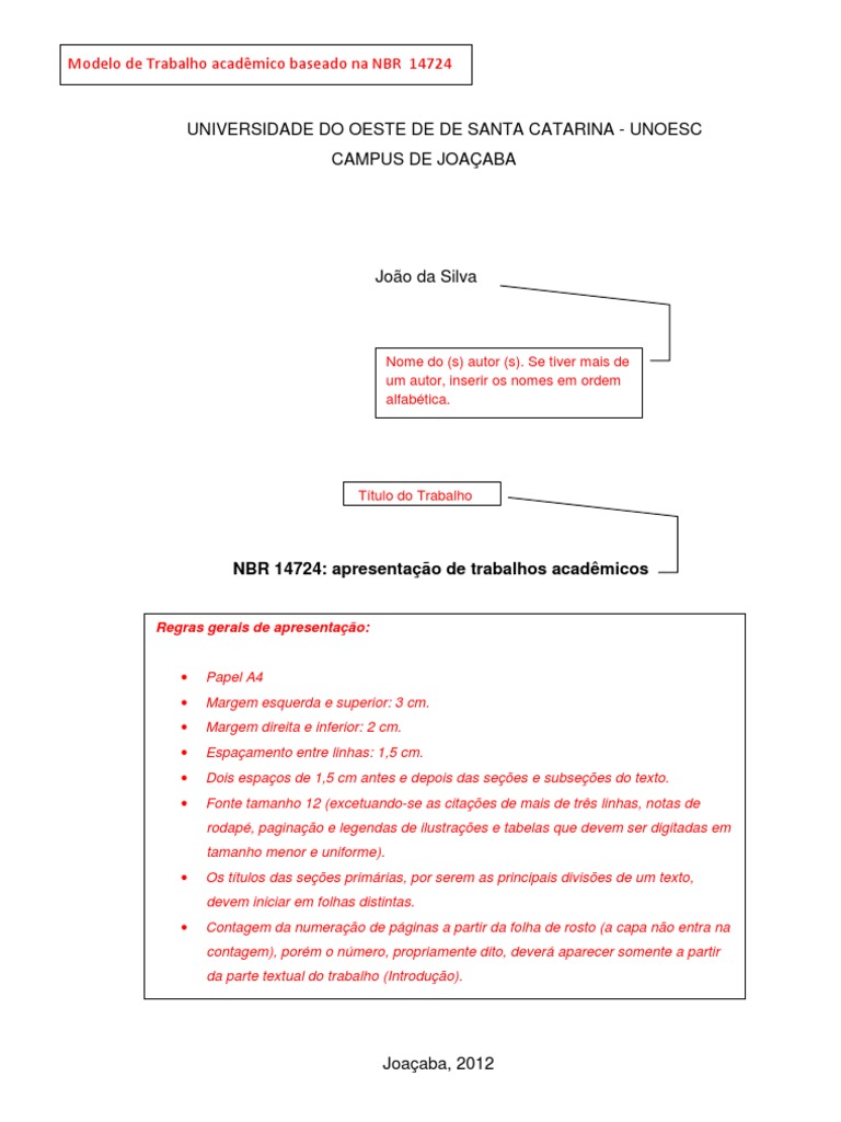 Apresenta as características exigíveis para a apresentação de trabalhos acadêmicos, conforme a norma técnica NBR 14724:2005, da Associação Brasileira de Normas Técnicas (ABNT). O objetivo é disponibilizar aos alunos um modelo de apresentação de trabalho acadêmico para ser utilizado durante a graduação. Omitiram-se alguns elementos opcionais descritos na norma, bem como alguns itens mais específicos, simplificando-o.