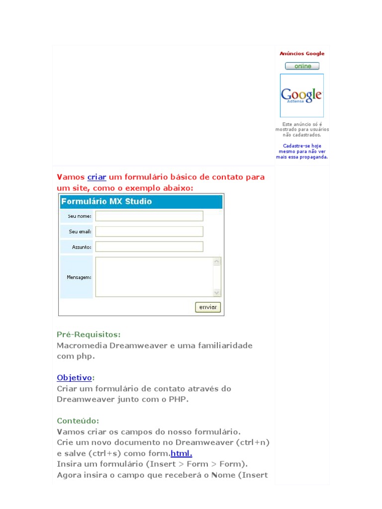 Pr-Requisitos: Macromedia Dreamweaver e uma familiaridade com php. Objetivo: Criar um formulrio de contato atravs do Dreamweaver junto com o PHP. Contedo: Vamos criar os campos do nosso formulrio. Crie um novo documento no Dreamweaver (ctrl+n) e salve (ctrl+s) como form.html. Insira um formulrio (Insert > Form > Form). Agora insira o campo que receber o Nome (Insert