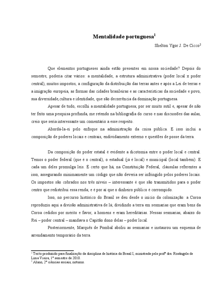 Que elementos portugueses ainda esto presentes em nossa sociedade? Depois do semestre, poderia citar vrios: a mentalidade, a estrutura administrativa (poder local x poder central), muitos impostos, a configurao da distribuio das terras antes e aps a Lei de terras e a imigrao europeia, as formas das cidades brasileiras e as caractersticas da sociedade e povo, sua diversidade,cultura e identidade, que so decorrncia da dominao portuguesa. Apesar de tudo, escolhi a mentalidade portuguesa; por ser muito sutil e, apesar de no ter feito uma pesquisa profunda, me retendo na bibliografia do curso e nas discusses das aulas, creio que seria interessante um comentrio a esse respeito. Abord-la-ei pelo enfoque na administrao da coisa pblica. E isso inclui a composio de poderes locais e centrais, endividamento externo e questes de posse da terra. Da composio do poder estatal evidente a dicotomia entre o poder local e central. Temos o poder federal (que o central), o estadual (j local) e municipal (local tambm). E cada um deles promulga leis. certo que h, na Constituio Federal, clusulas referentes a isso, assegurando minimamente um cdigo que no deveria ser infringido pelos poderes locais. Os impostos so cobrados nos trs nveis interessante que so transmitidos para o poder centro que redistribui essa renda; e por a que o dinheiro pblico corrompido. Isso, no percurso histrico do Brasil se deu desde o incio da colonizao: a Coroa reproduziu aqui a diviso administrativa de l; dividindo a terra em sesmarias que eram bens da Coroa cedidos por mrito e favor, a homens e eram hereditrias. Nessas sesmarias, abaixo do Rei poder central mandava o Capito dono delas poder local. Posteriormente, Marqus de Pombal aboliu as sesmarias e instaurou um esquema de arrendamento temporrio da terra.