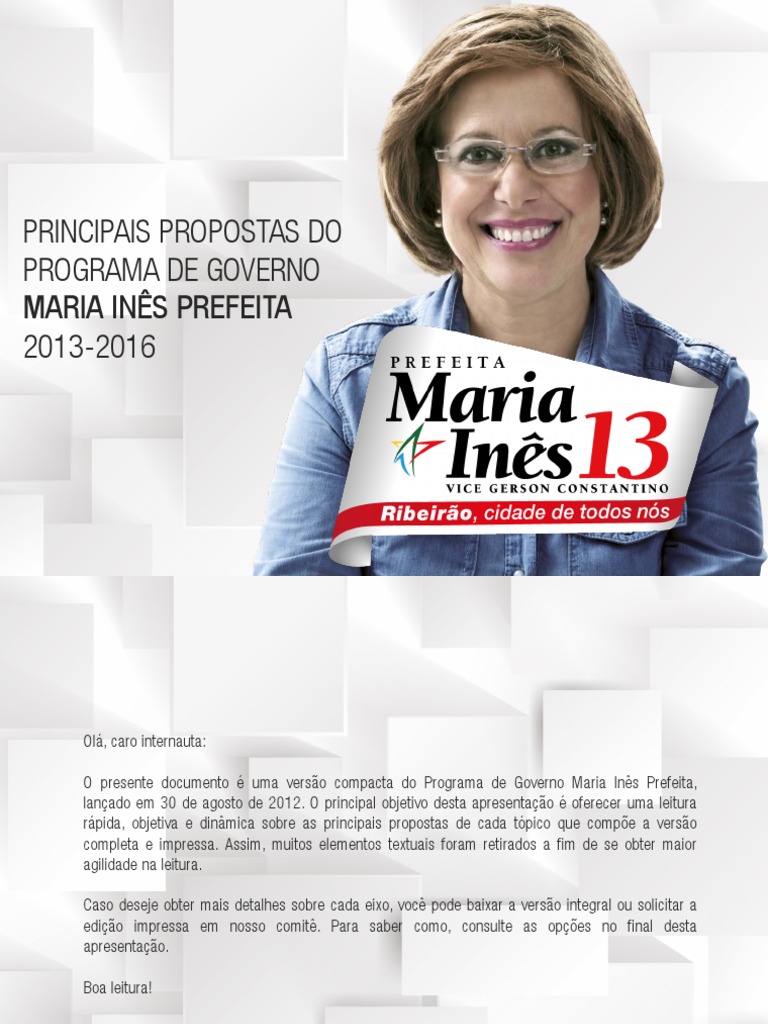 Ol, caro internauta: O presente documento uma verso compacta do Programa de Governo Maria Ins Prefeita, lanado em 30 de agosto de 2012. O principal objetivo desta apresentao oferecer uma leitura rpida, objetiva e dinmica sobre as principais propostas de cada tpico que compe a verso completa e impressa. Assim, muitos elementos textuais foram retirados a fim de se obter maior agilidade na leitura. Caso deseje obter mais detalhes sobre cada eixo, voc pode baixar a verso integral ou solicitar a edio impressa em nosso comit. Para saber como, consulte as opes no final desta apresentao. Boa leitura!