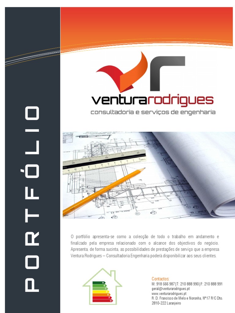 O portflio apresenta-se como a coleco de todo o trabalho em andamento e finalizado pela empresa relacionado com o alcance dos objectivos do negcio. Apresenta, de forma sucinta, as possibilidades de prestaes de servio que a empresa Ventura Rodrigues Consultadoria Engenharia poder disponibilizar aos seus clientes.