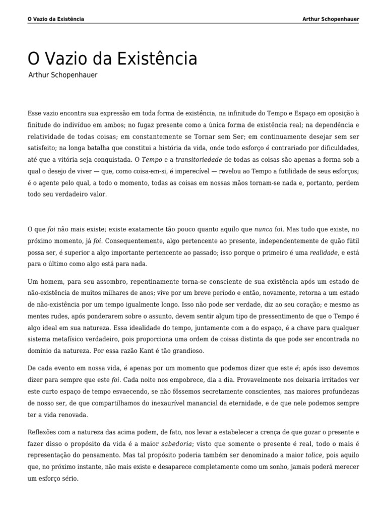 O que foi no mais existe; existe exatamente to pouco quanto aquilo que nunca foi. Mas tudo que existe, no prximo momento, j foi. Consequentemente, algo pertencente ao presente, independentemente de quo ftil possa ser, superior a algo importante pertencente ao passado; isso porque o primeiro uma realidade, e est para o ltimo como algo est para nada. Um homem, para seu assombro, repentinamente torna-se consciente de sua existncia aps um estado de no-existncia de muitos milhares de anos; vive por um breve perodo e ento, novamente, retorna a um estado de no-existncia por um tempo igualmente longo. Isso no pode ser verdade, diz ao seu corao; e mesmo as mentes rudes, aps ponderarem sobre o assunto, devem sentir algum tipo de pressentimento de que o Tempo algo ideal em sua natureza. Essa idealidade do tempo, juntamente com a do espao, a chave para qualquer sistema metafsico verdadeiro, pois proporciona uma ordem de coisas distinta da que pode ser encontrada no domnio da natureza. Por essa razo Kant to grandioso. De cada evento em nossa vida, apenas por um momento que podemos dizer que este ; aps isso devemos dizer para sempre que este foi. Cada noite nos empobrece, dia a dia. Provavelmente nos deixaria irritados ver este curto espao de tempo esvaecendo, se no fssemos secretamente conscientes, nas maiores profundezas de nosso ser, de que compartilhamos do inexaurvel manancial da eternidade, e de que nele podemos sempre ter a vida renovada. Reflexes com a natureza das acima podem, de fato, nos levar a estabelecer a crena de que gozar o presente e fazer disso o propsito da vida a maior sabedoria; visto que somente o presente real, todo o mais representao do pensamento. Mas tal propsito poderia tambm ser denominado a maior tolice, pois aquilo que, no prximo instante, no mais existe e desaparece completamente como um sonho, jamais poder merecer um esforo srio.