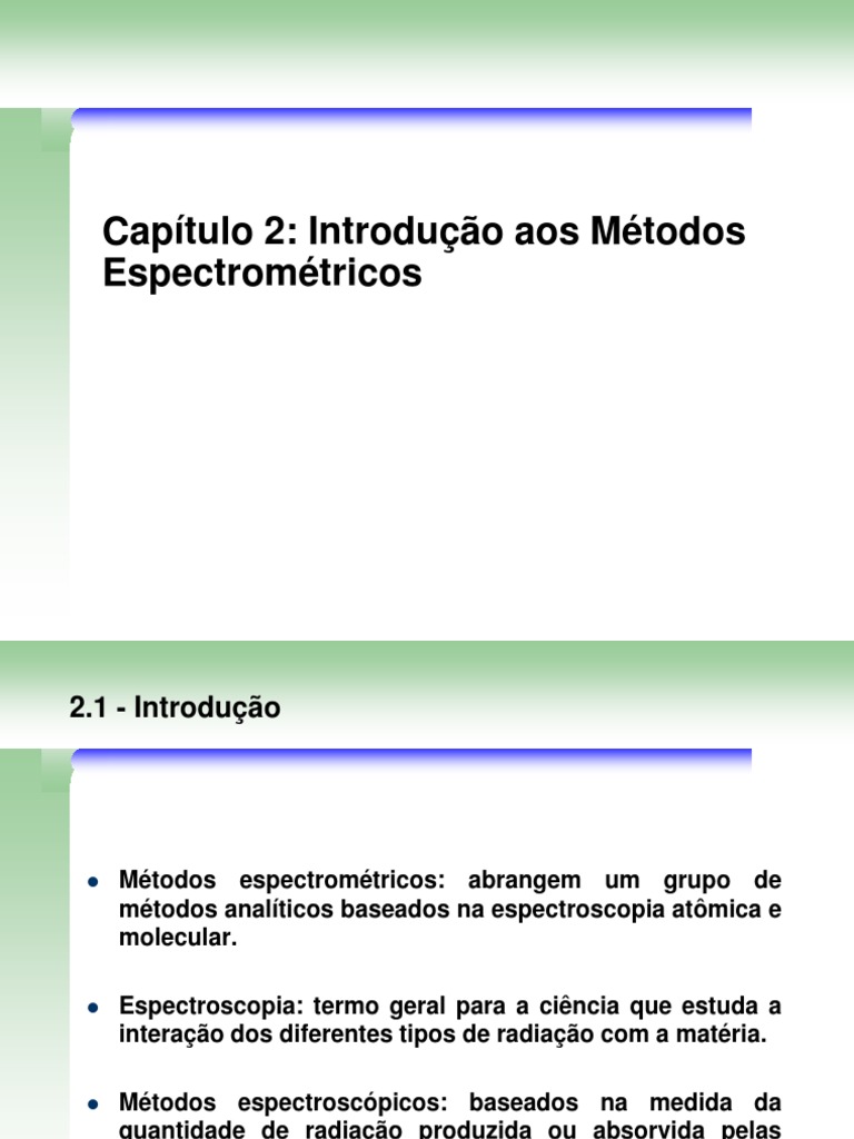 Mtodos espectromtricos: abrangem um grupo de mtodos analticos baseados na espectroscopia atmica e molecular. Espectroscopia: termo geral para a cincia que estuda a interao dos diferentes tipos de radiao com a matria.