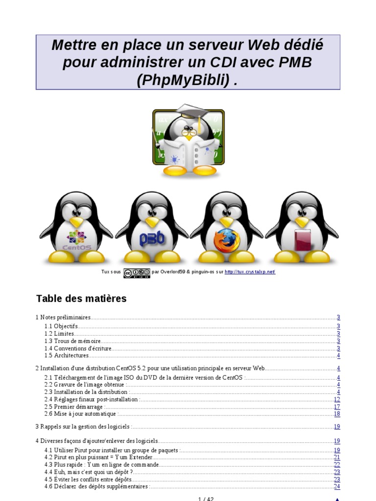 [1]Site de PMB (PhpMyBibli) [2] LAMP : Dfinition sur Wikipdia [3] CentOS sur Wikipdia [4] Site francophone de CentOS [5] Apache sur Wikipdia [6] Site officiel Apache [en] [7] MySQL sur Wikipdia [8] Site officiel MySQL [fr] [9] PHP sur Wikipdia [10]Site officiel PHP [11]Site de KeePass Pasword Safe [12]Site de KeePassX [13]KeePass Portable sur le site [Link] [14]FileZilla, client FTP de rfrence [site non officiel, fr] [15]MD5SUM sur [Link] [16]Prfrez le logiciel 7-Zip winrar : il est libre, gratuit et multi-plateforme ! [17]Un tutoriel pour modifier l'ordre de dmarrage sur les forums de 01Net. [18]Yum sur Wikipdia [19]Documentation de YUM sur fedora-fr. Ne pas tenir compte des dpts ! [20]RHEL sur Wikipdia [21]Fedora sur Wikipdia [22]Diffrence entre su et su sur fedora-fr [23]RPMForge [24]Extra Packages for Enterprise Linux (EPEL) [25]Site officiel PureFTPd [26]Bas sur la documentation de Fedora-fr : Installation_et_configuration_de_MySQL [27]UTF-8 sur Wikipdia [28]Site officiel 7-Zip [en] [29]L'ISO-8859-1 ay mal ! Limitations sur Wikipdia [30]Site officiel Notepad++ [31]Fiche Technique PMB 1.2 sur Citdoc [32]L'ensemble des fiches techniques PMB sur Citdoc. [33]Site officiel de Firefox. tlcharger d'urgence si vous ne l'utilisez pas dj ! [34]Explications des types d'indexation dcimale dans PMB. [35]Site officiel CeCILL, licence franaise de logiciel libre [36]SCONET sur Wikipdia [37]Site officiel du Projet SLIS [38]FQDN sur Wikipdia [39]Linux IP Masquerade HOW-TO [40]TCP sur Wikipdia [41]La catgorie SPIP sur Framasoft [42]DotClear sur Framasoft [43]Cahier de texte version chocolat par Pierre Lematre