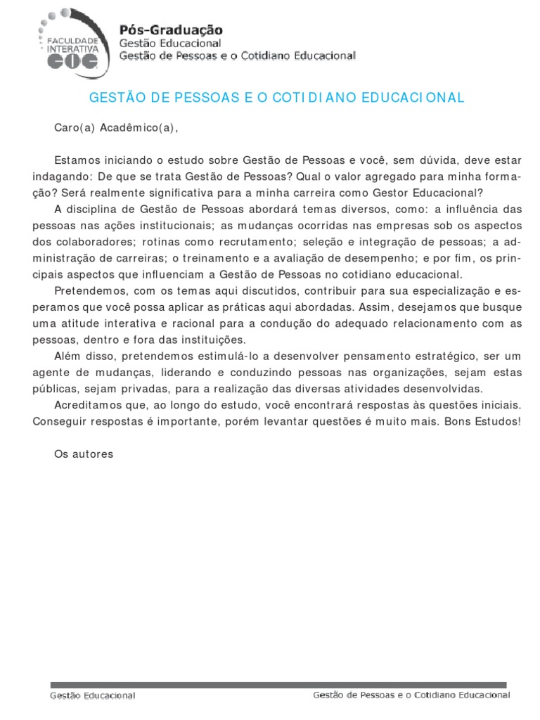 Caro(a) Acadmico(a), Estamos iniciando o estudo sobre Gesto de Pessoas e voc, sem dvida, deve estar indagando: De que se trata Gesto de Pessoas? Qual o valor agregado para minha formao? Ser realmente signicativa para a minha carreira como Gestor Educacional? A disciplina de Gesto de Pessoas abordar temas diversos, como: a inuncia das pessoas nas aes institucionais; as mudanas ocorridas nas empresas sob os aspectos dos colaboradores; rotinas como recrutamento; seleo e integrao de pessoas; a administrao de carreiras; o treinamento e a avaliao de desempenho; e por m, os principais aspectos que inuenciam a Gesto de Pessoas no cotidiano educacional. Pretendemos, com os temas aqui discutidos, contribuir para sua especializao e esperamos que voc possa aplicar as prticas aqui abordadas. Assim, desejamos que busque uma atitude interativa e racional para a conduo do adequado relacionamento com as pessoas, dentro e fora das instituies. Alm disso, pretendemos estimul-lo a desenvolver pensamento estratgico, ser um agente de mudanas, liderando e conduzindo pessoas nas organizaes, sejam estas pblicas, sejam privadas, para a realizao das diversas atividades desenvolvidas. Acreditamos que, ao longo do estudo, voc encontrar respostas s questes iniciais. Conseguir respostas importante, porm levantar questes muito mais. Bons Estudos! Os autores