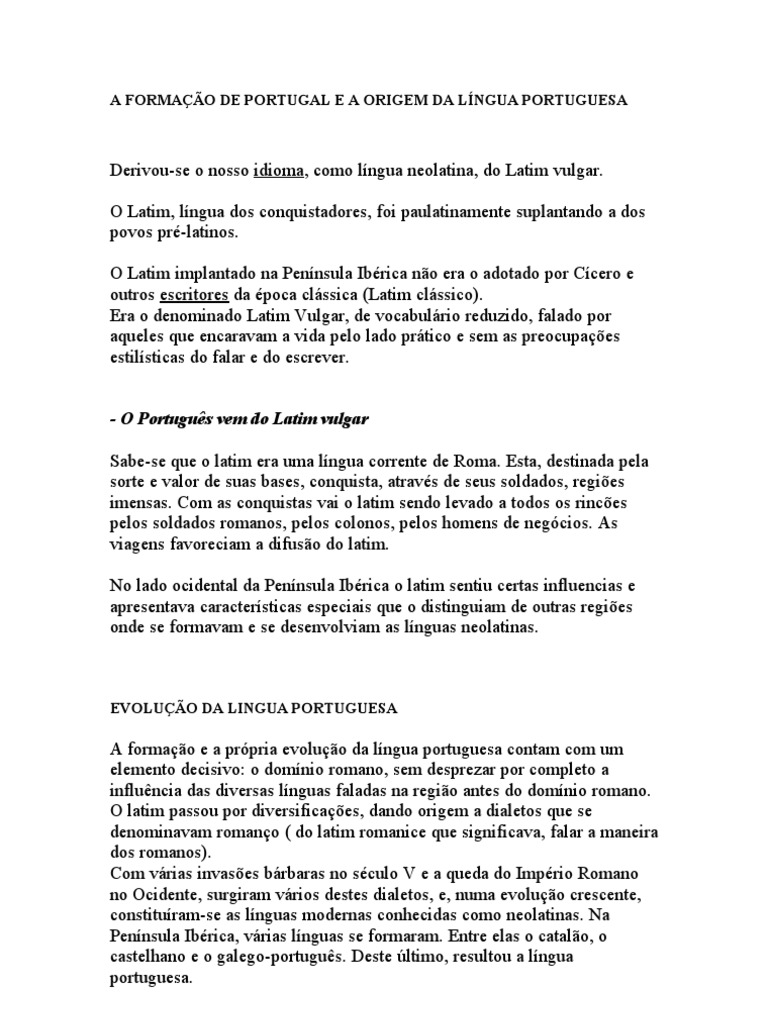 A formao e a prpria evoluo da lngua portuguesa contam com um elemento decisivo: o domnio romano, sem desprezar por completo a influncia das diversas lnguas faladas na regio antes do domnio romano. O latim passou por diversificaes, dando origem a dialetos que se denominavam romano ( do latim romanice que significava, falar a maneira dos romanos). Com vrias invases brbaras no sculo V e a queda do Imprio Romano no Ocidente, surgiram vrios destes dialetos, e, numa evoluo crescente, constituram-se as lnguas modernas conhecidas como neolatinas. Na Pennsula Ibrica, vrias lnguas se formaram. Entre elas o catalo, o castelhano e o galego-portugus. Deste ltimo, resultou a lngua portuguesa.
