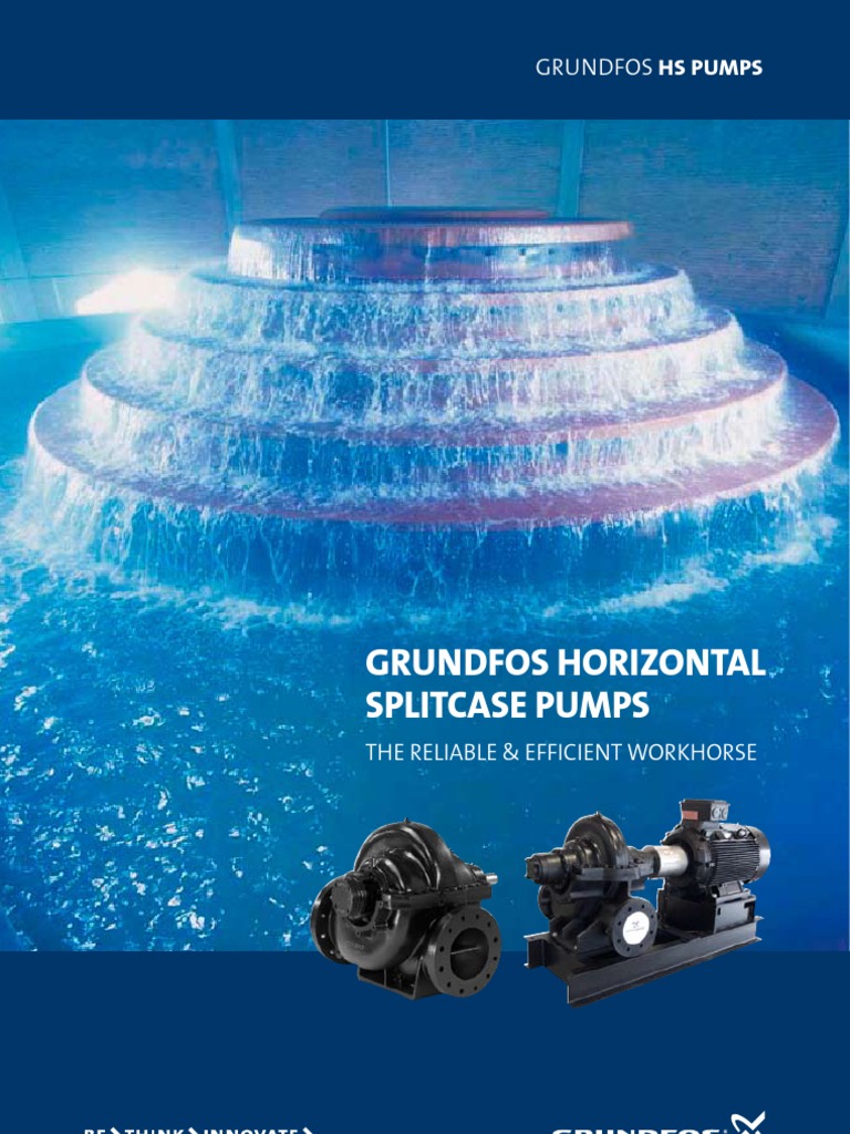 The pumps are non-self-priming, centrifugal volute pumps with radial suction and radial discharge ports and horizontal shaft. Suction and discharge flanges are PN 16 according to EN 1092-2 (DIN2501). Grundfos HS pumps are available in three different variants: 1. Pump with motor and base frame. 2. Bare shaft pump with base frame. 3. Bare shaft pump; ie pump without motor and without base frame. The split-case construction enables removal and dismantling of the internal pump parts, e.g. bearings, wear rings, impeller and shaft seal, without disturbing the motor and pipework. Replaceable case wear rings protect the pump casing while reducing maintenance costs and maintaining high operating efficiencies. The rotating assembly is dynamically balanced according to ISo 1940 class G6.3. Impellers are double suction providing long operating, corrosion free life. Impellers are constructed in ASTM B584 bronze and are hydraulically balanced. Bronze shaft sleeves protect the shaft and help with fixation of the impeller. Pump and motor are mounted on a common base frame in the form of a welded, steel C-channel profile.
