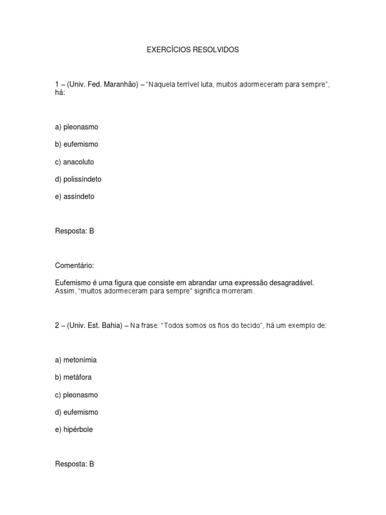 Comentrio: Eufemismo uma figura que consiste em abrandar uma expresso desagradvel. Assim, muitos adormeceram para sempre significa morreram.