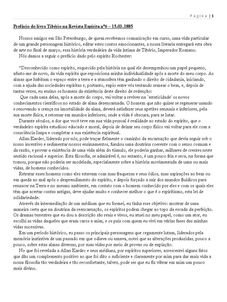 Prefcio do livro Tibrio na Revista Esprita n6 15.03.1885 Nossos amigos em So Petersburgo, de quem recebemos comunicao em curso, uma vida particular de um grande personagem histrico, editar estes contos emocionantes, a nossa livraria entregar esta obra de arte no final de maro, essa histria verdadeira da vida ntima de Tibrio, Imperador Romano. Ns damos a seguir o prefcio dado pelo esprito Rochester: Desconhecido como esprito, esquecido pela histria na qual ele desempenhou um papel pequeno, afasto-me de novo, da vida esprita que reposiciona minha individualidade aps a morte do meu corpo. As almas que habitam o espao entre a terra e a atmosfera tm ganhado o direito de cidadania, iniciando, com a ajuda das sociedades espritas e, portanto, expio entre vs tentando semear o bem, e, depois de tantas vezes, eu ensino os homens da existncia deste direito de redeno: Que cada uma delas, aps a morte do corpo, vai voltar a reviver na `erraticidade' os novos conhecimentos cientficos no estado de alma desencarnada. O homem que no quiser se regenerar usando e renovando a crena na imortalidade da alma, dever satisfazer seus apetites sensuais e inferiores, pela sua morte fsica, e retornar em mundos inferiores, onde a vida obscura, para se lutar. Durante sculos, a dor que voc teve em sua vida pessoal realidade ao estado do esprito, que o verdadeiro esprita estudioso educado e moral, depois de deixar seu corpo fsico vai voltar para ele com a conscincia limpa e completar a sua existncia espiritual. Allan Kardec, liderado por ns, pode traar fielmente o caminho da encarnao que devia seguir sob o nosso incentivo e sedimentar nossos ensinamentos, fundou uma doutrina coerente com o senso comum e da razo, e provar a existncia de uma vida alm do tmulo, ele poderia ganhar, milhares de crentes neste sentido racional e superior. Esta filosofia, se admirvel , no entanto, um pouco fria e seca, na forma que tomou, porque no poderia ser modelada, especialmente sobre a histria movimentada de uma ou mais vidas, de homens conhecidos. Retratar esses homens como eles estavam com suas fraquezas e seus dios, suas aspiraes ao bem ou em queda ao mal aps o desprendimento do esprito, e depois forado a sair dos mundos fludicos para renascer na Terra e no mesmo ambiente, em contato com o homem conhecido por eles e com os quais eles tm que acertar contas antigas, deve ajudar muito e conhecer melhor o que o espiritismo, esta lei de solidariedade. Atravs da intermediao de um mdium que eu formei, eu tinha esse objetivo: mostrar de uma maneira certa que na doutrina da reencarnao, os espritos podem chegar ao topo da escada da perfeio. Os dramas terrestres que eu dou a descrio so reais e vivos, eu atuei no meu papel, como um ator, eu escolhi as vidas daqueles que eram caros a mim, e os pais com quem eu vivi em vrias fases das minhas vidas sucessivas. Em um perodo histrico, eu passo os principais personagens que cegamente lutam, liderados pela memria instintiva de um passado em que odiava ou amava, notei que as alteraes produzidas, pouco a pouco, sobre estas almas diversas, por suas vidas por meio de provas ou de expiao. No que foi revelada a Allan Kardec e seus mdiuns, por espritos superiores, acrescentei alguns fatos que do um complemento positivo ao que foi dito o suficiente e claramente por mim para dar mais vida a nossa filosofia to verdadeira e to reconfortante, talvez, pode ser que eu fiz vibrar em mim um pouco mais divino.