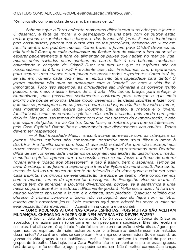 Sabemos que a Terra enfrenta momentos difceis com suas crianas e jovens. O desamor, a falta de moral e o desrespeito de uns para com os outros esto embaraando o caminho das crianas e dos jovens at Jesus. E estes, inebriados pelo consumismo, partem em busca das coisas perecveis, deixando de viver em famlia dentro dos padres morais. Como trazer o jovem para Cristo? Devemos ou no faz-lo? Claro que cada trabalhador do Senhor tem de colocar a isca no anzol e esperar pacientemente a hora de alimentar os peixes que nadam no mar da vida, muitos deles saciados pelos apetites da carne. Sair rua batendo tambores, anunciando a chegada de Cristo? Dizer em alta voz que os espritas so os trabalhadores da ltima hora? evidente que no. Precisamos, sim, preparar-nos para segurar uma criana e um jovem em nossas mos experientes. Como faz-lo, se so em nmero cada vez maior e muitos no tm capacidade para tanto? O jovem moderno no quer se preocupar com a morte, se nem a vida lhe importante. Tudo isso sabemos, as dificuldades so inmeras e os obreiros muito poucos, mas mesmo assim temos de ir luta. No temos braos para enlaar a Humanidade, mas possumos sentimentos bastantes para abraar o que mais prximo de ns se encontra. Desse modo, devemos ir s Casas Espritas e fazer com que elas se preocupem com os jovens e com as crianas, no lhes levando o temor, mas mostrando o lado alegre da Doutrina. Da, ento, a criana e o jovem, familiarizados com os ensinos espritas, no sero atacados pelo medo nem pelo ridculo. Mas para isso temos de fazer com que eles gostem da evangelizao, e no que sejam obrigados a ir ao Centro. Como fazer, entretanto, para que se interessem pela Casa Esprita? Dando-lhes a importncia que dispensamos aos adultos. Todos devem ser respeitados. A Espiritualidade Maior, encontrava-se apreensiva com as crianas e os jovens. Muitos espritas no conseguem transmitir para seus filhos o amor Doutrina. E a famlia sofre com isso, O que est errado? Por que no conseguimos trazer nossos filhos e netos para a Doutrina? Porque apresentamos uma Doutrina difcil de ser compreendida, matamos os dogmas mas ainda no destrumos o medo, e muitos espritas apresentam a obsesso como se ela fosse o inferno de ontem: quem erra jogado aos obsessores, e no assim, bem o sabemos. Temos de levar criana e ao jovem a esperana e lhes dar lies de moral crist. Para tanto, temos de tir-los um pouco da frente da televiso e do vdeo-game e criar em cada Casa Esprita, nos grupos de evangelizao, a equipe de teatro. Para concorrermos com o mundo, temos de apresentar passagens do Evangelho vivo no teatro. A criana tem de aprender a Doutrina divertindo-se, porque, se a sentarmos a uma mesa s para desenhar e estudar, dificilmente gostar. Voltamos a dizer: l fora um mundo violento aprisiona o jovem e a criana, sem piedade. Qualquer religio que oferecer criana somente a teoria no conseguir que ela fique nem na letra, quanto mais encontrar Jesus! Hoje estamos aqui para orient-los sobre o valor da evangelizao infanto-juvenil. Acendi minha cadeira e perguntei: