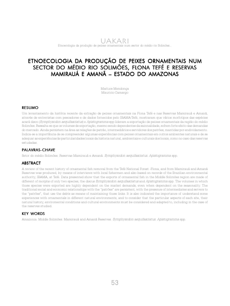 Adams, C. As florestas virgens manejadas. Boletim do Museu Paraense Emlio Goeldi. Srie Antropologia. 10 (1), 1994. Ambrus, S. Small but key Amazon industry in trouble. EcoAmricas. Novembro:6-8. 2005. Castro, E. Territrio, Biodiversidade e Saberes de Populaes Tradicionais. In: Castro, E. Pinton, Fl. (Org.). Faces do Trpico mido: Conceitos e questes sobre Desenvolvimento e Meio Ambiente. Belm: Cejup, 1997. Chao, N. L. Fisheries, diversity and conservation of ornamental fishes of the Rio Negro Basin, Brazil A Review of Project Piaba (1989-1999). In: Chao, N.L. , Petry, G.; Prang, G. ; L. Sonneschien & M. Tlusty. Conservation and Management of Ornamental Fish Resources of the Rio Negro Basin, Amazonia, Brazil: Projeto Piaba. Universidade do Estado do Amazonas, Manaus. 309p. 2001. CONVENTION ON BIOLOGICAL DIVERSITY. United Nations Conference on environment and Development, Rio de Janeiro, Brasil. 1992. Crampton, W .G.R. Plano de manejo para o uso sustentvel de peixes ornamentais na Reserva Mamirau. In: Queiroz, H.L. & W .G.R. Crampton (eds). Estratgias para Manejo de Recursos Pesqueiros em Mamirau. Sociedade Civil Mamirau /CNPq: 159-176. Brasil. 1999.