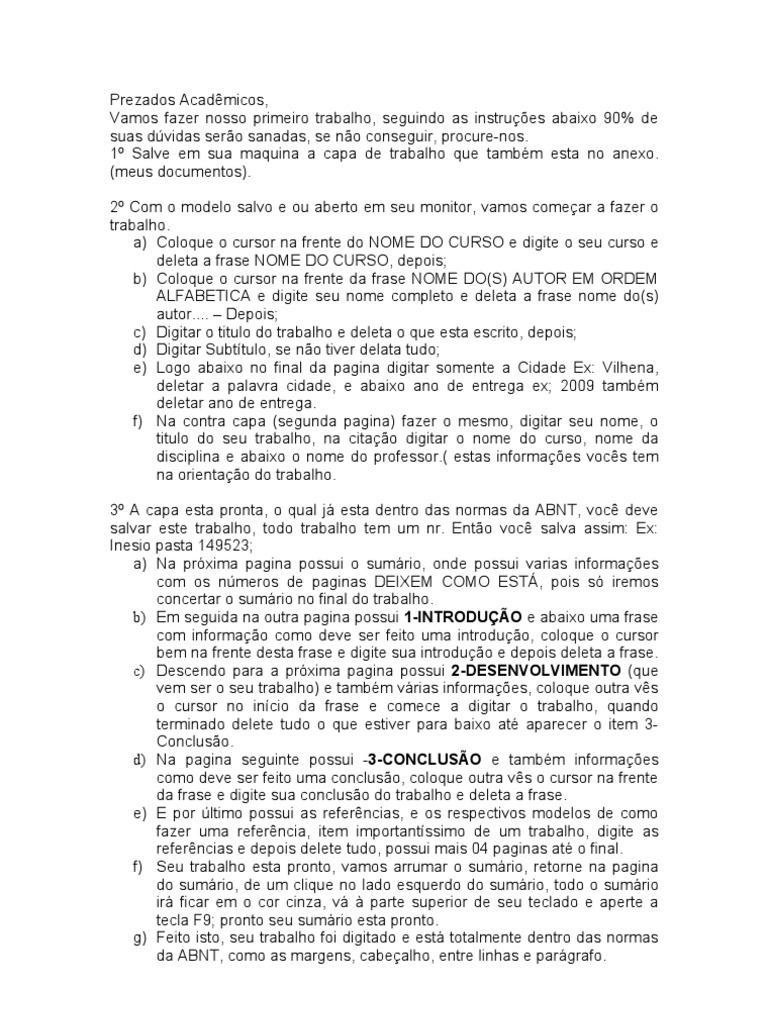 se no conseguir, procure-nos. 1 Salve em sua maquina a capa de trabalho que tambm esta no anexo. (meus documentos). 2 Com o modelo salvo e ou aberto em seu monitor, vamos comear a fazer o trabalho. a) Coloque o cursor na frente do NOME DO CURSO e digite o seu curso e deleta a frase NOME DO CURSO, depois; b) Coloque o cursor na frente da frase NOME DO(S) AUTOR EM ORDEM ALFABETICA e digite seu nome completo e deleta a frase nome do(s) autor.... Depois; c) Digitar o titulo do trabalho e deleta o que esta escrito, depois; d) Digitar Subttulo, se no tiver delata tudo; e) Logo abaixo no final da pagina digitar somente a Cidade Ex: Vilhena, deletar a palavra cidade, e abaixo ano de entrega ex; 2009 tambm deletar ano de entrega. f) Na contra capa (segunda pagina) fazer o mesmo, digitar seu nome, o titulo do seu trabalho, na citao digitar o nome do curso, nome da disciplina e abaixo o nome do professor.( estas informaes vocs tem na orientao do trabalho. 3 A capa esta pronta, o qual j esta dentro das normas da ABNT, voc deve salvar este trabalho, todo trabalho tem um nr. Ento voc salva assim: Ex: Inesio pasta 149523; a) Na prxima pagina possui o sumrio, onde possui varias informaes com os nmeros de paginas DEIXEM COMO EST, pois s iremos concertar o sumrio no final do trabalho. b) Em seguida na outra pagina possui 1-INTRODUO e abaixo uma frase com informao como deve ser feito uma introduo, coloque o cursor bem na frente desta frase e digite sua introduo e depois deleta a frase. c) Descendo para a prxima pagina possui 2-DESENVOLVIMENTO (que vem ser o seu trabalho) e tambm vrias informaes, coloque outra vs o cursor no incio da frase e comece a digitar o trabalho, quando terminado delete tudo o que estiver para baixo at aparecer o item 3Concluso. d) Na pagina seguinte possui -3-CONCLUSO e tambm informaes como deve ser feito uma concluso, coloque outra vs o cursor na frente da frase e digite sua concluso do trabalho e deleta a frase. e) E por ltimo possui as referncias, e os respectivos modelos de como fazer uma referncia, item importantssimo de um trabalho, digite as referncias e depois delete tudo, possui mais 04 paginas at o final. f) Seu trabalho esta pronto, vamos arrumar o sumrio, retorne na pagina do sumrio, de um clique no lado esquerdo do sumrio, todo o sumrio ir ficar em o cor cinza, v parte superior de seu teclado e aperte a tecla F9; pronto seu sumrio esta pronto. g) Feito isto, seu trabalho foi digitado e est totalmente dentro das normas da ABNT, como as margens, cabealho, entre linhas e pargrafo.