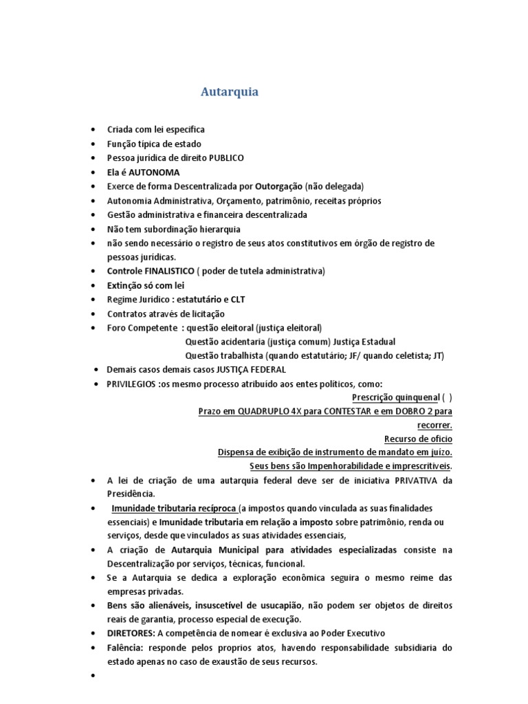 Criada com lei especifica Funo tpica de estado Pessoa jurdica de direito PUBLICO Ela AUTONOMA Exerce de forma Descentralizada por Outorgao (no delegada) Autonomia Administrativa, Oramento, patrimnio, receitas prprios Gesto administrativa e financeira descentralizada No tem subordinao hierarquia no sendo necessrio o registro de seus atos constitutivos em rgo de registro de pessoas jurdicas. Controle FINALISTICO ( poder de tutela administrativa) Extino s com lei Regime Juridico : estatutrio e CLT Contratos atravs de licitao Foro Competente : questo eleitoral (justia eleitoral) Questo acidentaria (justia comum) Justia Estadual Questo trabalhista (quando estatutrio; JF/ quando celetista; JT) Demais casos demais casos JUSTIA FEDERAL PRIVILEGIOS :os mesmo processo atribudo aos entes polticos, como: Prescrio quinquenal ( ) Prazo em QUADRUPLO 4X para CONTESTAR e em DOBRO 2 para recorrer. Recurso de oficio Dispensa de exibio de instrumento de mandato em juzo. Seus bens so Impenhorabilidade e imprescritiveis. A lei de criao de uma autarquia federal deve ser de iniciativa PRIVATIVA da Presidncia. Imunidade tributaria recproca (a impostos quando vinculada as suas finalidades essenciais) e Imunidade tributaria em relao a imposto sobre patrimnio, renda ou servios, desde que vinculados as suas atividades essenciais, A criao de Autarquia Municipal para atividades especializadas consiste na Descentralizao por servios, tcnicas, funcional. Se a Autarquia se dedica a explorao econmica seguira o mesmo reime das empresas privadas. Bens so alienveis, insuscetvel de usucapio, no podem ser objetos de direitos reais de garantia, processo especial de execuo. DIRETORES: A competncia de nomear exclusiva ao Poder Executivo Falncia: responde pelos proprios atos, havendo responsabilidade subsidiaria do estado apenas no caso de exausto de seus recursos.