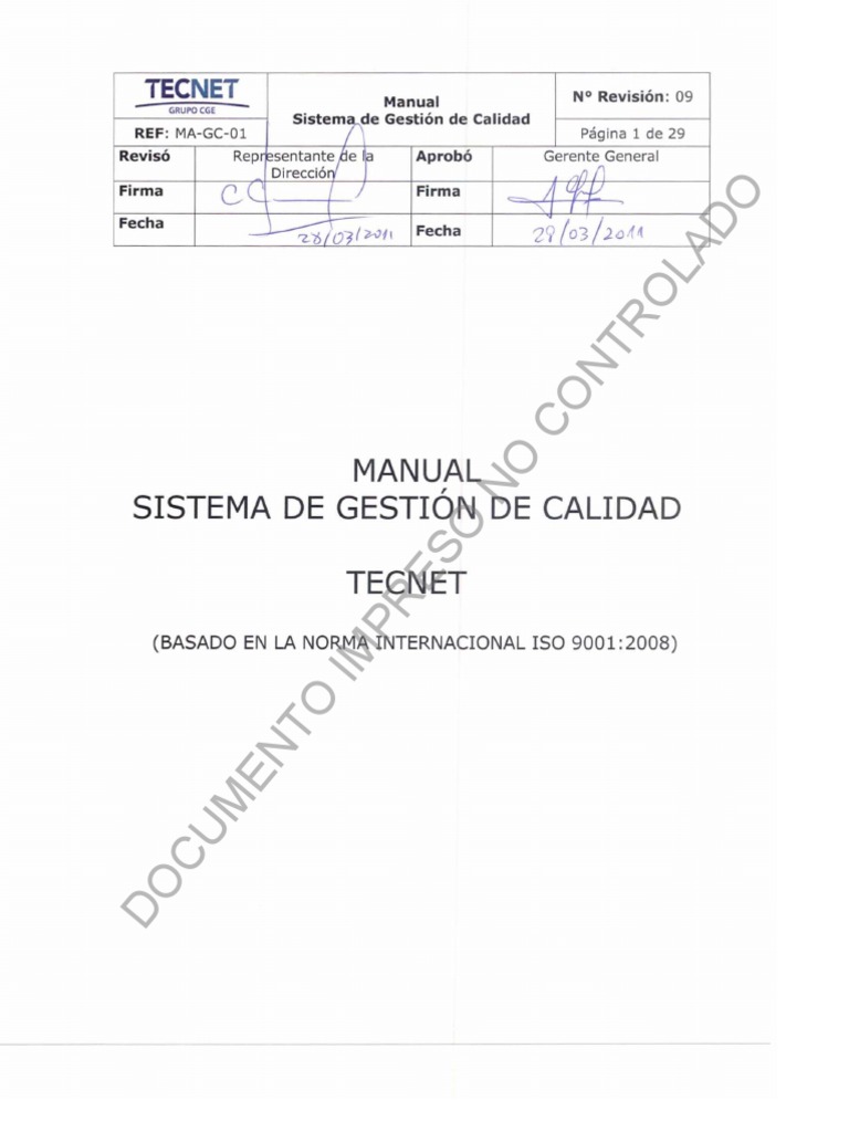 N Revisin: 09 Manual Sistema de Gestin de Calidad REF: MA-GC-01 CAPTULO I: Introduccin 1.1. Propsito del Documento El documento que a continuacin se presenta tiene por objeto: Describir el Sistema de Gestin de Calidad implementado por TECNET en conformidad con los requisitos establecidos en la Norma Internacional ISO 9001:2008 Sistemas de Gestin de Calidad - Requisitos. Comunicar la Poltica de Calidad a todos los Empleados y Trabajadores de la Empresa. Posibilitar un mejor entendimiento y control de las prcticas definidas en el Sistema de Gestin de Calidad. Entregar bases documentadas para entrenar al personal en los requisitos del Sistema de Gestin de Calidad. Pgina 3 de 29