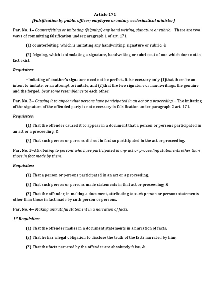 1 Counterfeiting or imitating (feigning) any hand writing, signature or rubric. There are two ways of committing falsification under paragraph 1 of art. 171 (1) counterfeiting, which is imitating any handwriting, signature or rubric; & (2) feigning, which is simulating a signature, handwriting or rubric out of one which does not in fact exist. Requisites: Imitating of another’s signature need not be perfect. It is necessary only (1)that there be an intent to imitate, or an attempt to imitate, and (2)that the two signature or handwritings, the genuine and the forged, bear some resemblance to each other. Par. No. 2 Causing it to appear that persons have participated in an act or a proceeding. The imitating of the signature of the offended party is not necessary in falsification under paragraph 2 art. 171. Requisites: (1) That the offender caused it to appear in a document that a person or persons participated in an act or a proceeding; & (2) That such person or persons did not in fact so participated in the act or proceeding. Par. No. 3Attributing to persons who have participated in any act or proceeding statements other than those in fact made by them. Requisites: (1) That a person or persons participated in an act or a proceeding; (2) That such person or persons made statements in that act or proceeding; & (3) That the offender, in making a document, attributing to such person or persons statements other than those in fact made by such person or persons. Par. No. 4 Making untruthful statement in a narration of facts. 1st Requisites: (1) That the offender makes in a document statements in a narration of facts; (2) That he has a legal obligation to disclose the truth of the facts narrated by him; (3) That the facts narrated by the offender are absolutely false; &