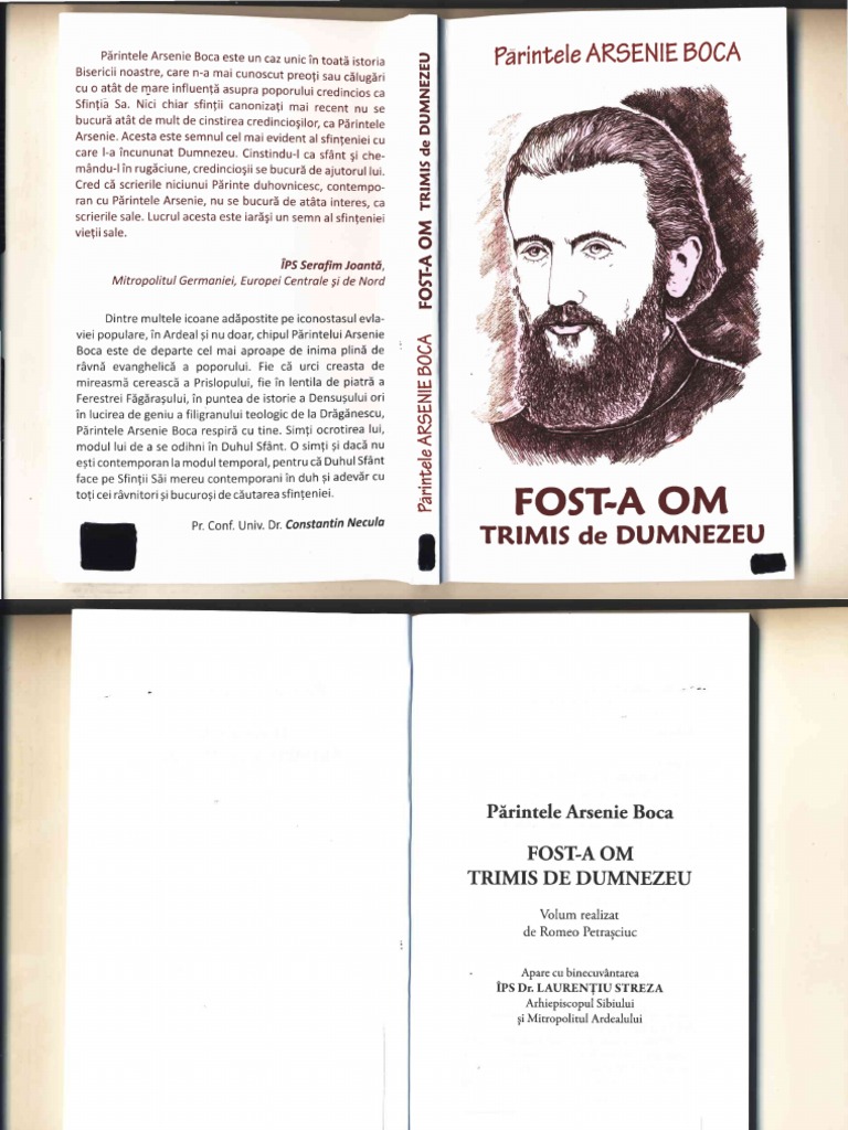 indoieli ori a tratat anemii sufletesti. fel deManual de Un Pastorald, deloc scolastic deloc pentru ;colari, dar nici si simplist, pistrA.ndin taina cuvintelor rosrite o seriede tri.iri de nerostit. in sateleFi.gira;ului ori alelirii BArsei, in tronul Arhieresc centrat pe Minel Europa, in ri.coarea unei viegi- cum sunt doui. minunate icoanefeminine in volumul de fagi -, in vietile povestitorilormi.rturisitori, Pi.rintele este viu, esteparreintegranti.a lucririi Duhului Sf6.nt via;aTirii. Sub neguri, un soare. in Nu estecuprinsi.nici in obiectivullucrS.rii acesteia si nici in materialele cuprinsedeja intr-un al treileavolum de interviuri (careva apLreain cur6.nd)vreo dorinti. de exacerbare chipului duhovnicescal Pirintelui Arsenie a Boca.Pirintele nu poatefi impus insi.teologieiviitorului, vie;ii duhovnicegti Bisericii,doar cu reactiiemotionale. a Or, astfelde pietre de preg,decantate timp si reasezare in in memoria nidijduitoare a unui popor siri.cit de valori, nu pot prinde decit bine. in Hristos, a cid rAnduriledespre oameniiLui, careau suspendat nebuniaucigi.toare de s.uflet,confirmi.nd lucrareaDuhului Sfhnt in Neamul rom6.nesc, poatefi decAtnidijduitoare. Arheologiapronu pusi de Romeo Petrasciuc satele orasele in si noastre,in ministiri ori locuri insingurate, obligatorie.Generatiile e celor ce l-au cunoscutpe Pirintele sunt tot mai risfirate, diluate in mareavietii, parte rimAnind drept mirturie, parte trecAndpragul vesniciei,mirturisiti de Hristos ca prieteni ai Sii. Sunt inci filoanede diamant duhovnicesc neexploratede interogatia omului tinir. Togi sunt gazde excelente, dispuseoricAndsi vorbeascidesprePi.rintele. E o bucurie pentru ei pretuireaBisericii!Ei nu au nevoie de confirmiri. Pentru ei, Pirintele Arsenie Boca este grabnicasi statornica mingi.iere a Duhului Sfbnt.