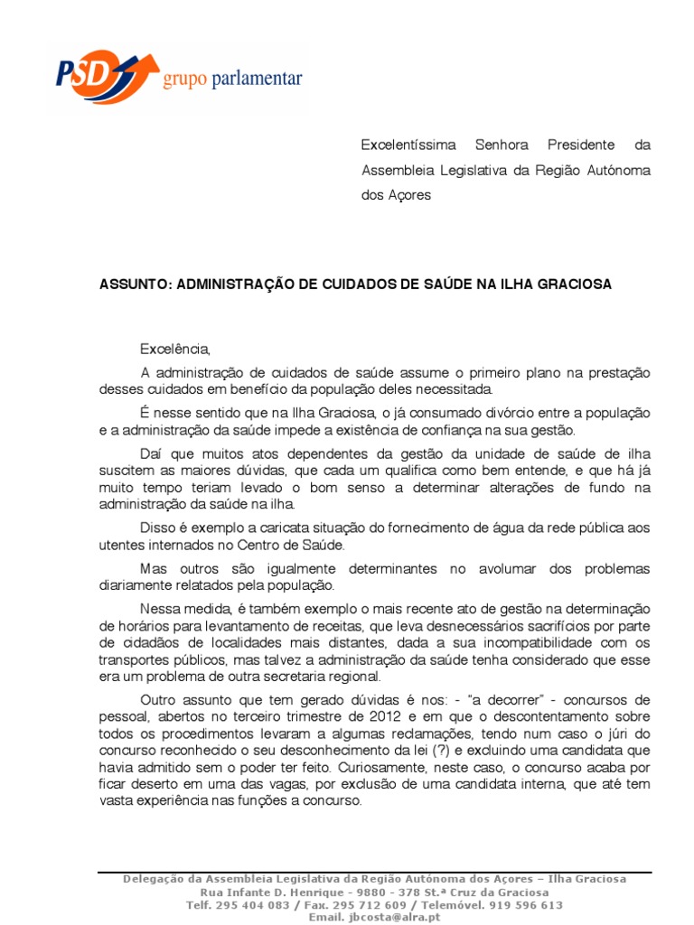 Em outra vertente so conhecidas, e reconhecidas pela generalidade dos Graciosenses, constituindo factos pblicos, que a poltica tem contribudo para o mau ambiente entre prestadores de cuidados e a administrao da sade. So demasiadas dvidas sobre todo o administrar da sade na ilha que certamente o Governo no querer estar alheio e ter todo o interesse em esclarecer e em resolver. A populao da ilha Graciosa merece que seja posto um ponto final sobre esta conturbada relao entre quem deve servir e os destinatrios de uma boa administrao de cuidados de sade. Assim, ao abrigo das disposies regimentais aplicveis, deputados signatrios solicitam ao Governo Regional o seguinte esclarecimento: os