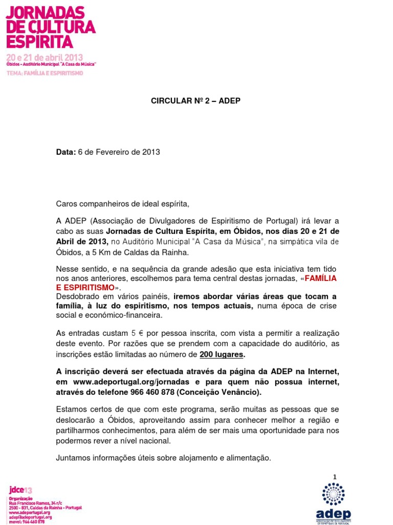 A ADEP (Associação de Divulgadores de Espiritismo de Portugal) irá levar a cabo as suas Jornadas de Cultura Espírita, em Óbidos, nos dias 20 e 21 de Abril de 2013, no Auditório Municipal “A Casa da Música”, na simpática vila de Óbidos, a 5 Km de Caldas da Rainha.
