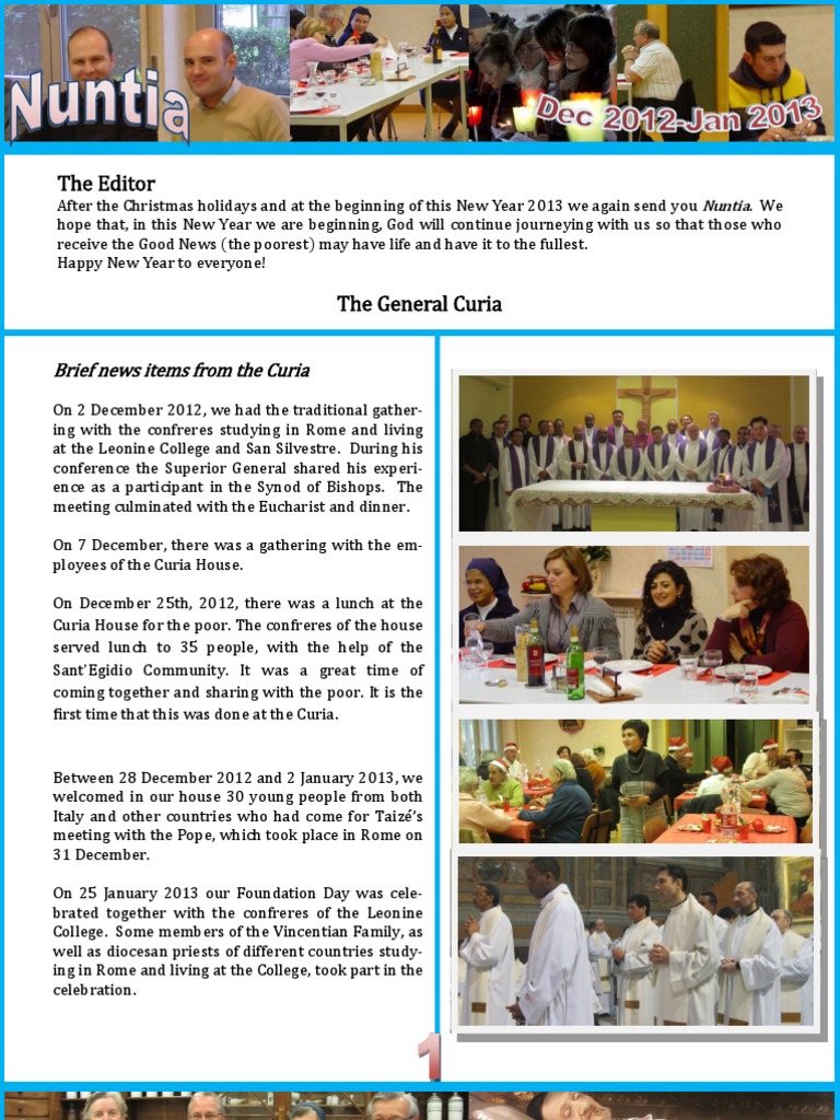 Between 28 December 2012 and 2 January 2013, we welcomed in our house 30 young people from both Italy and other countries who had come for Taizs meeting with the Pope, which took place in Rome on 31 December. On 25 January 2013 our Foundation Day was celebrated together with the confreres of the Leonine College. Some members of the Vincentian Family, as well as diocesan priests of different countries studying in Rome and living at the College, took part in the celebration.