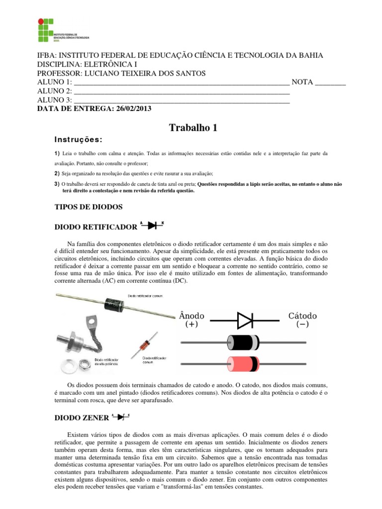 IFBA: INSTITUTO FEDERAL DE EDUCAÇÃO CIÊNCIA E TECNOLOGIA DA BAHIA DISCIPLINA: ELETRÔNICA I PROFESSOR: LUCIANO TEIXEIRA DOS SANTOS