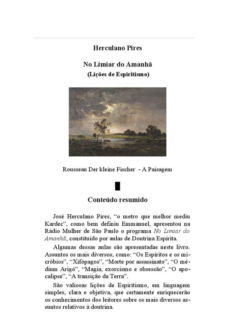 José Herculano Pires, “o metro que melhor mediu Kardec”, como bem definiu Emmanuel, apresentou na Rádio Mulher de São Paulo o programa No Limiar do Amanhã, constituído por aulas de Doutrina Espírita. Algumas dessas aulas são apresentadas neste livro. Assuntos os mais diversos, como: “Os Espíritos e os mi- cróbios”, “Xifópagos”, “Morte por assassinato”, “O mé- dium Arigó”, “Magia, exorcismo e obsessão”, “O apo- calipse”, “A transição da Terra”. São valiosas lições de Espiritismo, em linguagem simples, clara e objetiva, que certamente enriquecerão os conhecimentos dos leitores sobre os mais diversos as- suntos relativos à doutrina.