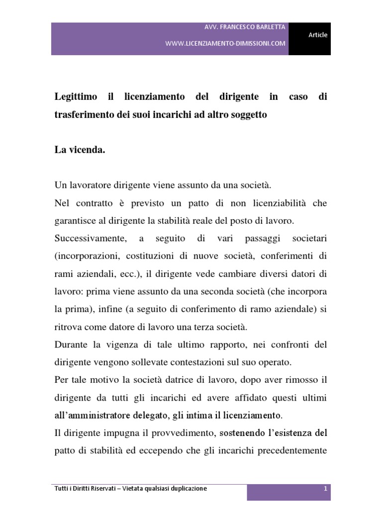 Un lavoratore dirigente viene assunto da una societ. Nel contratto previsto un patto di non licenziabilit che garantisce al dirigente la stabilit reale del posto di lavoro. Successivamente, a seguito di vari passaggi societari