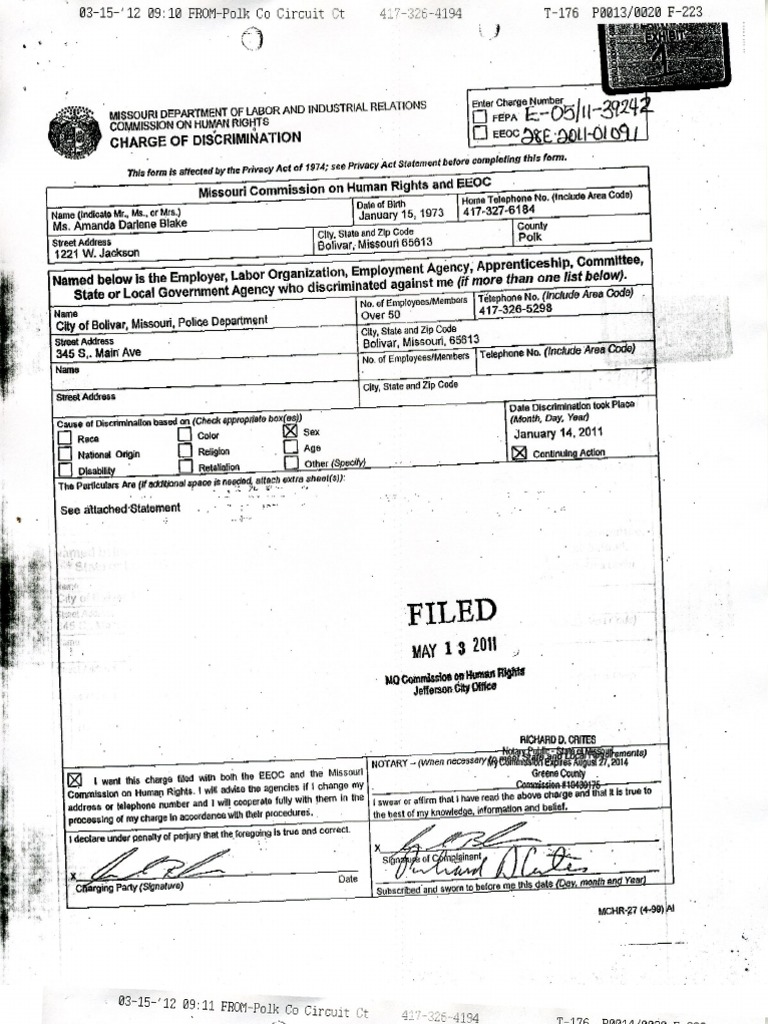 Named below Is the Employer, Labor Organization, Employment Agency; State or Local Government Agency who discriminated against me (if more than one list below). ,No. ofEmployee,fMembOf. Telephone o.(Includema Code) N . 417-326-5298 Nem. Over50 Cityof Bolivar, issouri, oli~ Departm~nt M P City,Sial. and Zipcoda