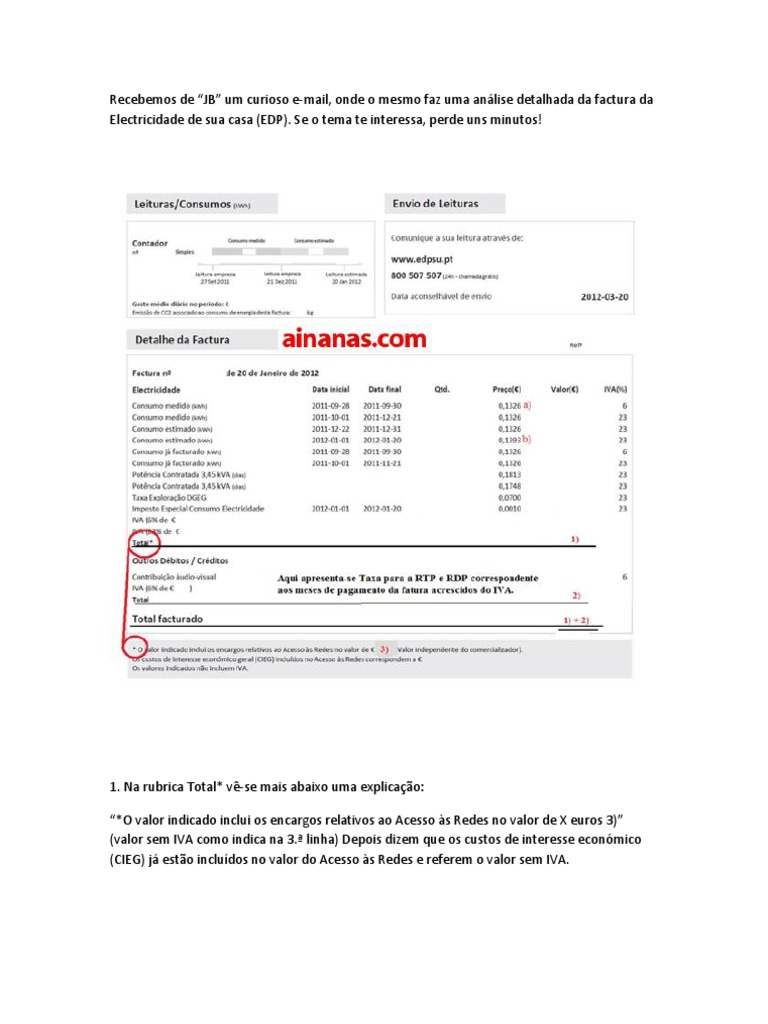 1. Na rubrica Total* vê-se mais abaixo uma explicação: “*O valor indicado inclui os encargos relativos ao Acesso às Redes no valor de X euros 3)” (valor sem IVA como indica na 3.ª linha) Depois dizem que os custos de interesse económico (CIEG) já estão incluídos no valor do Acesso às Redes e referem o valor sem IVA.