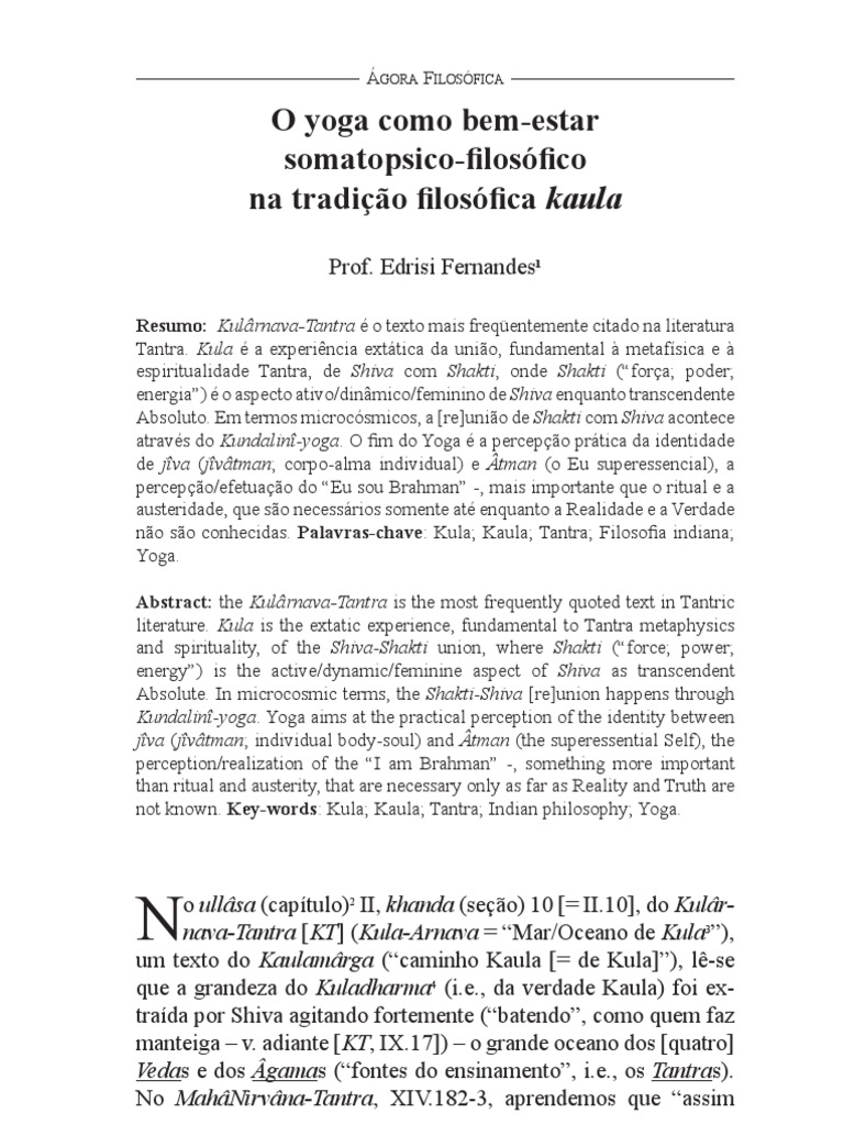 Transcendente enquanto Kula equivale a Sakala Brahman, o Absoluto Diferenciado (Cf. WOODROOFFE, 1913, p. XLV). Algumas vezes o termo Kula tomado como sinnimo de Shakti como o poder que resulta da unio do aspecto ativo/dinmico com o aspecto passivo/esttico da Divindade. Segundo BANERJEA (1983, p. 97), em razo do impulso interno da Divina Shakti para auto-expresso e auto-desfrute fenomnicos, ocorre algum tipo de despertar, de ativao, de desenvolvimento (que freqentemente descrito nos Vedas como tapas, calor; esforo caloroso; austeridade; ascese) na/da natureza transcendente do Esprito Absoluto (Brahman ou Shiva [ou shvara id., p. 91], ou qualquer que seja o nome pelo qual o Esprito Transcendente pode ser designado). Ainda para BANERJEA (1983, p. 31), o yogi tem de perceber/efetuar no apenas a unidade da alma individual [jva] com a Alma Csmica [tman], mas tambm a unidade do corpo individual [pinda] com o Corpo Csmico [dya-Pinda]. Apenas algum que conhea a identidade entre o corpo (pinda) e o Mundo (Brahmnda, o ovo de Brahm) pode ser chamado de guru (Kulrnava-Tantra, XIII.88)32. Quando o ideal supremo de unicao perfeita (samarasakarana) verdadeiramente percebido/efetuado, a diferena entre Matria [corpo] e Esprito [alma] esvanece (BANERJEA, 1983, p. 31). O Kulrnava-Tantra [KT] tem a forma de um longo dilogo ou dilogos entre Shr Dev33 e Shr shvara34. Esse dilogo se apresenta como a soma e a culminncia das cinco mnyas (faces [de Shiva]; tradies; ensinamentos revelados), sendo propriamente a tradio suprema (rdvhmnya - KT, III), superior s tradies do Mantra-, Bhakti-, Karma- e Jna-yoga35. Tornase claro, a partir da leitura do Kulrnava-Tantra (IX.30), que a doutrina Kaula considera o Yoga essencialmente, a [percepo prtica da] identidade de jva (jvtman) e tman36; a percepo/ efetuao do Aham Brahman asmi, Eu sou Brahman (IX.30; citando o Brihadranyaka-Upanishad, I.4.10) -, como sendo mais importante que o ritual e a austeridade, que so necessrios somente at enquanto a Realidade e a Verdade no so conhecidas (KT, I.113). Aqui, jva (jivtman) e tman equivalem, no vocabuAno 4 n. 2 jul./dez. 2004 - 51