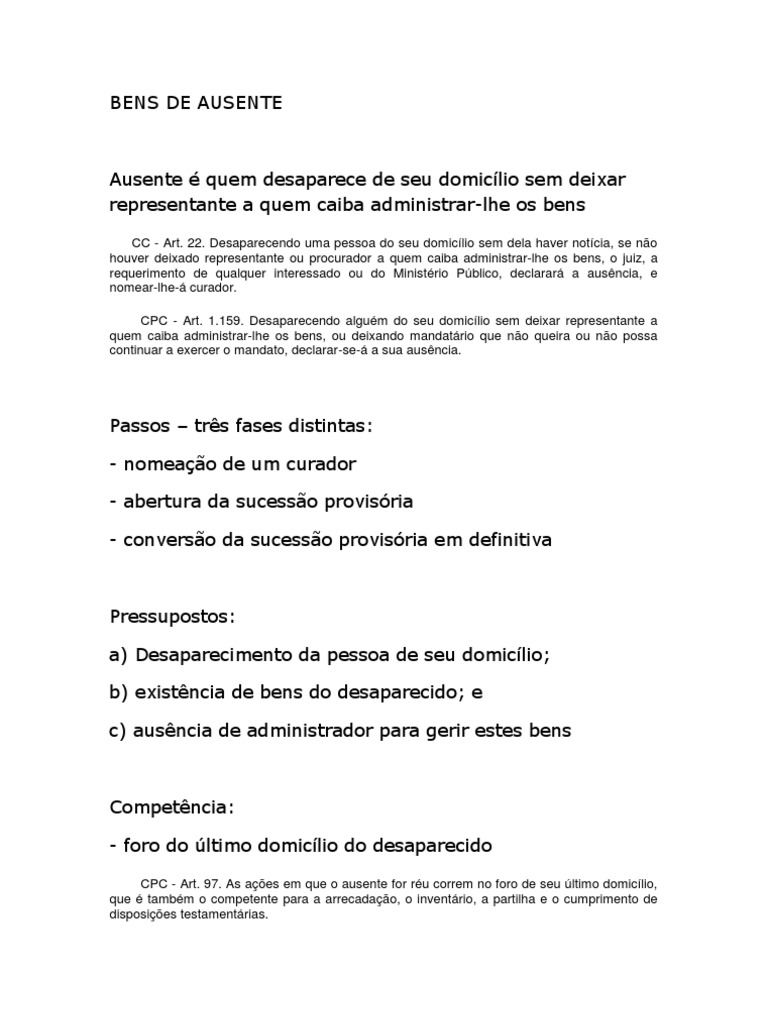 caso contrário será uma vara cível FASES DO PROCEDIMENTO: São três estágios distintos a) nomeação de um curador ao ausente e arrecadação dos bens. ou deixando mandatário que não queira ou não possa continuar a exercer o mandato.159. no Brasil.se o domicílio for incerto. o cumprimento de disposições de última vontade e todas as ações em que o espólio for réu. a competência se fixará no foro da situação dos bens CPC . é o competente para o inventário. 1. c) presunção de morte do ausente e conversão da sucessão provisória em definitiva I) NOMEAÇÃO DO CURADOR E ARRECADAÇÃO DOS BENS CPC . É. porém. a partilha. se o autor da herança não possuía domicílio certo. 96. ainda que o óbito tenha ocorrido no estrangeiro.. COMPETÊNCIA II Se houver Vara de Família. competente o foro: I . Parágrafo único. O foro do domicílio do autor da herança. Desaparecendo alguém do seu domicílio sem deixar representante a quem caiba administrar-lhe os bens.Art. declarar-se-á a sua ausência.Art. b) abertura da sucessão provisória. . a arrecadação.da situação dos bens.