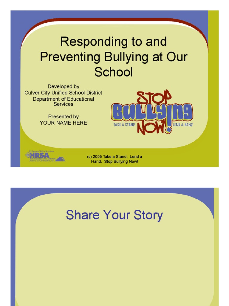 More than 20 tip sheets/fact sheets Database of existing bullying prevention resources Bullying prevention programs Books, videos, other resources Available on the web (stopbullyingnow.hrsa.gov) or in hard copy via HRSA Helpline (1-888-ASKHRSA)