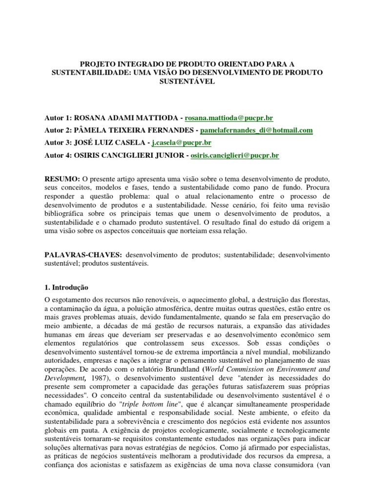 Autor 1: ROSANA ADAMI MATTIODA - rosana.mattioda@pucpr.br Autor 2: PÂMELA TEIXEIRA FERNANDES - pamelafernandes_di@hotmail.com Autor 3: JOSÉ LUIZ CASELA - j.casela@pucpr.br Autor 4: OSIRIS CANCIGLIERI JUNIOR - osiris.canciglieri@pucpr.br RESUMO: O presente artigo apresenta uma visão sobre o tema desenvolvimento de produto, seus conceitos, modelos e fases, tendo a sustentabilidade como pano de fundo. Procura responder a questão problema: qual o atual relacionamento entre o processo de desenvolvimento de produtos e a sustentabilidade. Nesse cenário, foi feito uma revisão bibliográfica sobre os principais temas que unem o desenvolvimento de produtos, a sustentabilidade e o chamado produto sustentável. O resultado final do estudo dá origem a uma visão sobre os aspectos conceituais que norteiam essa relação. PALAVRAS-CHAVES: desenvolvimento de produtos; sustentabilidade; desenvolvimento sustentável; produtos sustentáveis. 1. Introdução O esgotamento dos recursos não renováveis, o aquecimento global, a destruição das florestas, a contaminação da água, a poluição atmosférica, dentre muitas outras questões, estão entre os mais graves problemas atuais, devido fundamentalmente, quando se fala em preservação do meio ambiente, a décadas de má gestão de recursos naturais, a expansão das atividades humanas em áreas que deveriam ser preservadas e ao desenvolvimento econômico sem elementos regulatórios que controlassem seus excessos. Sob essas condições o desenvolvimento sustentável tornou-se de extrema importância a nível mundial, mobilizando autoridades, empresas e nações a integrar o pensamento sustentável no planejamento de suas operações. De acordo com o relatório Brundtland (World Commission on Environment and Development, 1987), o desenvolvimento sustentável deve "atender às necessidades do presente sem comprometer a capacidade das gerações futuras satisfazerem suas próprias necessidades". O conceito central da sustentabilidade ou desenvolvimento sustentável é o chamado equilíbrio do "triple bottom line", que é alcançar simultaneamente prosperidade econômica, qualidade ambiental e responsabilidade social. Neste ambiente, o efeito da sustentabilidade para a sobrevivência e crescimento dos negócios está evidente nos assuntos globais em pauta. A exigência de projetos ecologicamente, socialmente e tecnologicamente sustentáveis tornaram-se requisitos constantemente estudados nas organizações para indicar soluções alternativas para novas estratégias de negócios. Como já afirmado por especialistas, as práticas de negócios sustentáveis melhoram a produtividade dos recursos da empresa, a confiança dos acionistas e satisfazem as exigências de uma nova classe consumidora (van