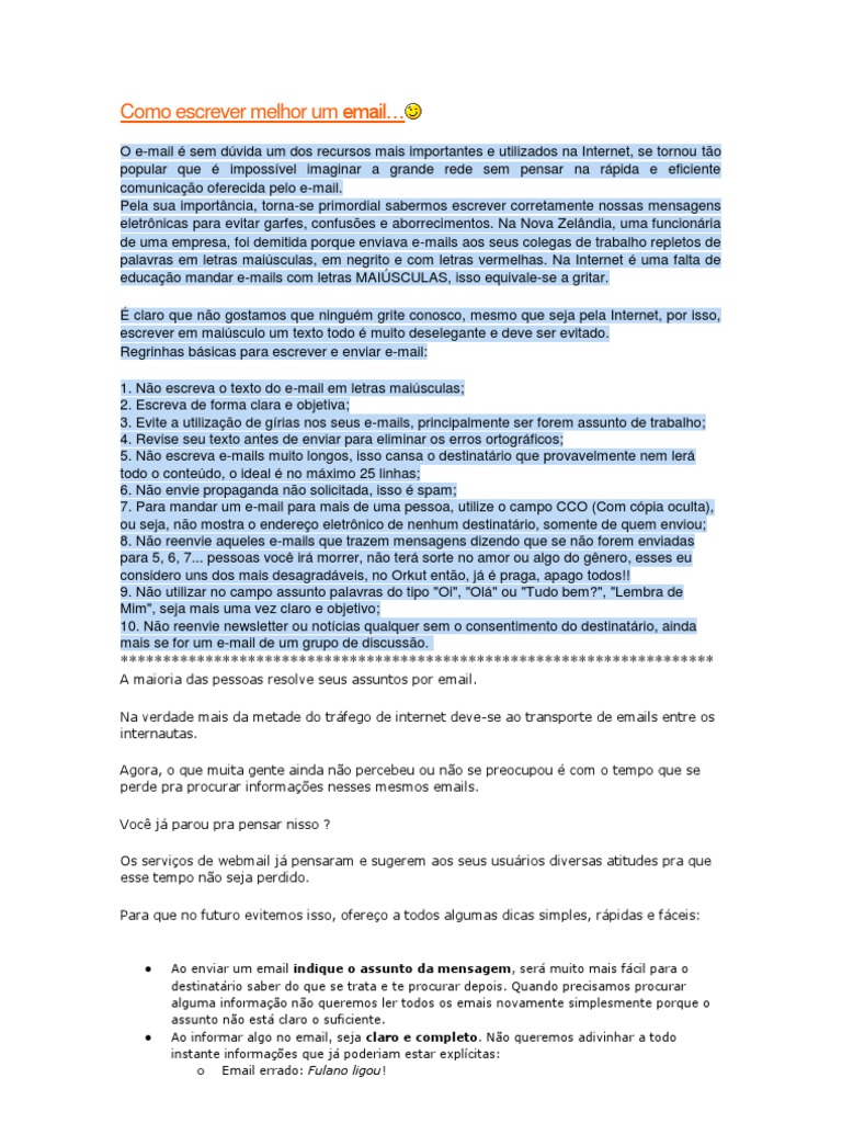 O e-mail sem dvida um dos recursos mais importantes e utilizados na Internet, se tornou to popular que impossvel imaginar a grande rede sem pensar na rpida e eficiente comunicao oferecida pelo e-mail. Pela sua importncia, torna-se primordial sabermos escrever corretamente nossas mensagens eletrnicas para evitar garfes, confuses e aborrecimentos. Na Nova Zelndia, uma funcionria de uma empresa, foi demitida porque enviava e-mails aos seus colegas de trabalho repletos de palavras em letras maisculas, em negrito e com letras vermelhas. Na Internet uma falta de educao mandar e-mails com letras MAISCULAS, isso equivale-se a gritar. claro que no gostamos que ningum grite conosco, mesmo que seja pela Internet, por isso, escrever em maisculo um texto todo muito deselegante e deve ser evitado. Regrinhas bsicas para escrever e enviar e-mail: 1. No escreva o texto do e-mail em letras maisculas; 2. Escreva de forma clara e objetiva; 3. Evite a utilizao de grias nos seus e-mails, principalmente ser forem assunto de trabalho; 4. Revise seu texto antes de enviar para eliminar os erros ortogrficos; 5. No escreva e-mails muito longos, isso cansa o destinatrio que provavelmente nem ler todo o contedo, o ideal no mximo 25 linhas; 6. No envie propaganda no solicitada, isso spam; 7. Para mandar um e-mail para mais de uma pessoa, utilize o campo CCO (Com cpia oculta), ou seja, no mostra o endereo eletrnico de nenhum destinatrio, somente de quem enviou; 8. No reenvie aqueles e-mails que trazem mensagens dizendo que se no forem enviadas para 5, 6, 7... pessoas voc ir morrer, no ter sorte no amor ou algo do gnero, esses eu considero uns dos mais desagradveis, no Orkut ento, j praga, apago todos!! 9. No utilizar no campo assunto palavras do tipo "Oi", "Ol" ou "Tudo bem?", "Lembra de Mim", seja mais uma vez claro e objetivo; 10. No reenvie newsletter ou notcias qualquer sem o consentimento do destinatrio, ainda mais se for um e-mail de um grupo de discusso.