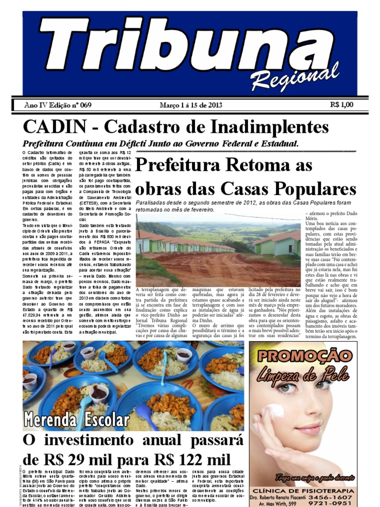 A parceria entre o Jornal Tribuna Regional e a OrienteSP Soluções Digitais chega à um novo âmbito, a junção entre o tradicionalismo da mídia impressa junto à uma empresa li- gada às tendências da rede mundial de computadores trará ao leitor um jornal mais dinâmico sem abrir mão da respon- sabilidade de um jornalismo sério e implacável. O “jornal que todo mundo lê” trará para as novas edições inovações no layout e sincronia com a internet; tudo vol- tado à nossa cidade e assuntos que interessam à nossa população. As sugestões de matéria poderão ser enviadas via e-mail pelo endereço tribunaregionalsp@gmail.com ou pelo site www.orientesp.com.br . Embora jornais não sejam divididos em capítulos, este é um novo capítulo em nossa história.